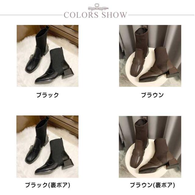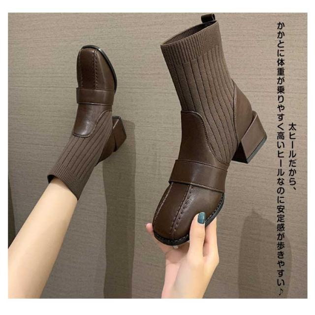 靴下ブーツ レディース ソックスブーツ チャンキーヒール ストレッチ 5センチヒール ニットソックスブーツ ニットブーツ ブラック ブラウン 裹ボア ボア 伸縮性 美脚 フィット ボア リブニット きれいめ おしゃれ ショートブーツ