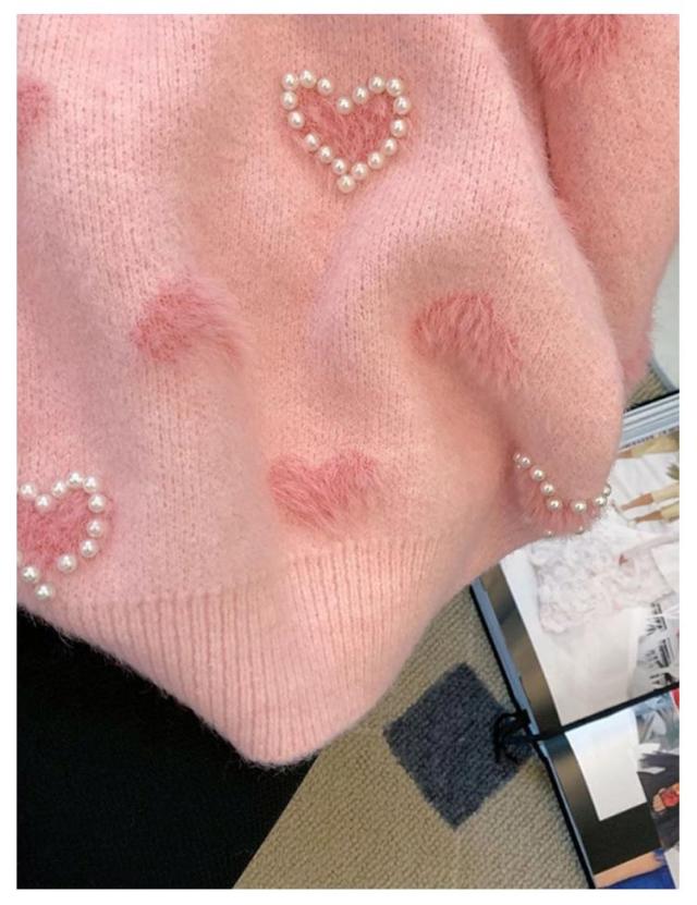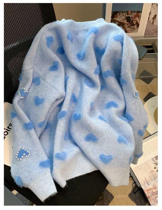 総柄 クルーネック ニットセーター パール付き プルオーバー 可愛い ニットトップス レディース 秋冬 ゆったり ニット 厚手 ハート柄 セーター あたっか 防寒 体型カバー きれいめ 大人 おしゃれ 大きいサイズ ブルー ピンク ニット