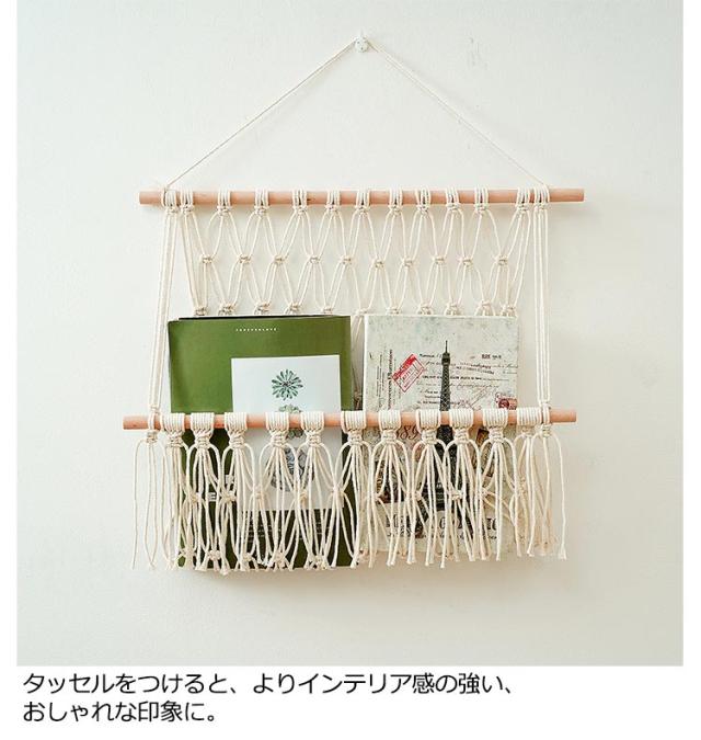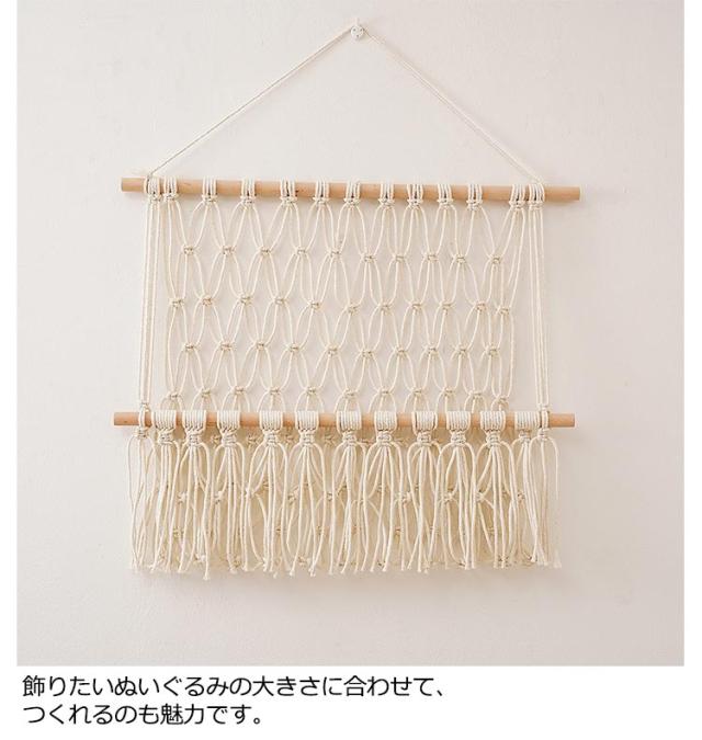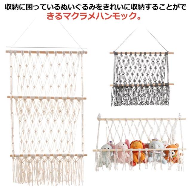 | 収納に困っているぬいぐるみをきれいに収納することができるマクラメハンモック。 壁掛けもでき、浮かせる収納もでき、様々な場所で設置できます。 ぬいぐるみ収納をしながら飾ることができるため、一石二鳥です。 タッセルをつけると、よりインテリア感の強い、おしゃれな印象に。 飾りたいぬいぐるみの大きさに合わせて、つくれるのも魅力です。 | |
