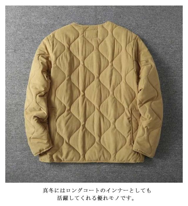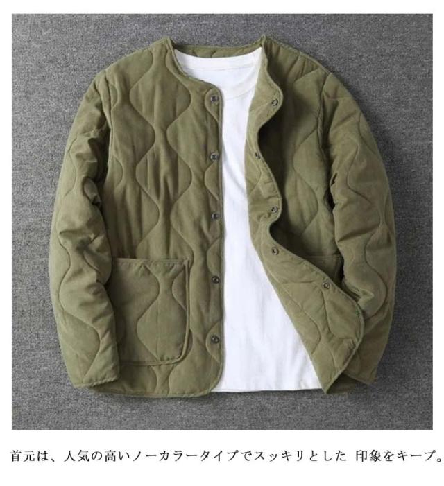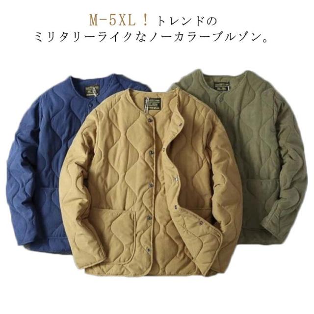 | M-5XL!トレンドのミリタリーライクなノーカラーブルゾン。 とっても軽い上にしっかりとした防寒性があり暖かいのが人気の秘訣。 ひょうたん型のキルティングによって中綿が偏りにくく、全体をバランスよく暖めてくれます。 首元は、人気の高いノーカラータイプでスッキリとした 印象をキープ。 アウターとしてはもちろん、室内で肌寒い時に羽織ったり、車移動やワンマイルウエアとしても大活躍! 真冬にはロングコートのインナーとしても活躍してくれる優れモノです。 | |