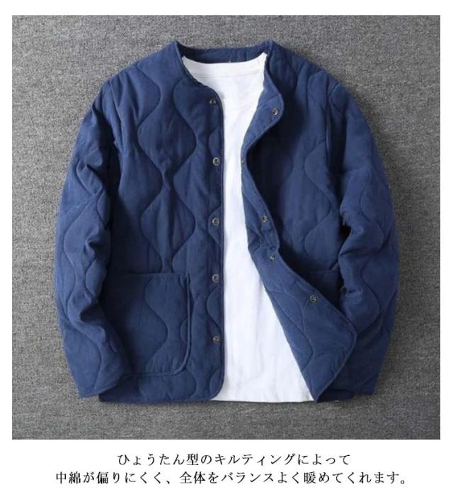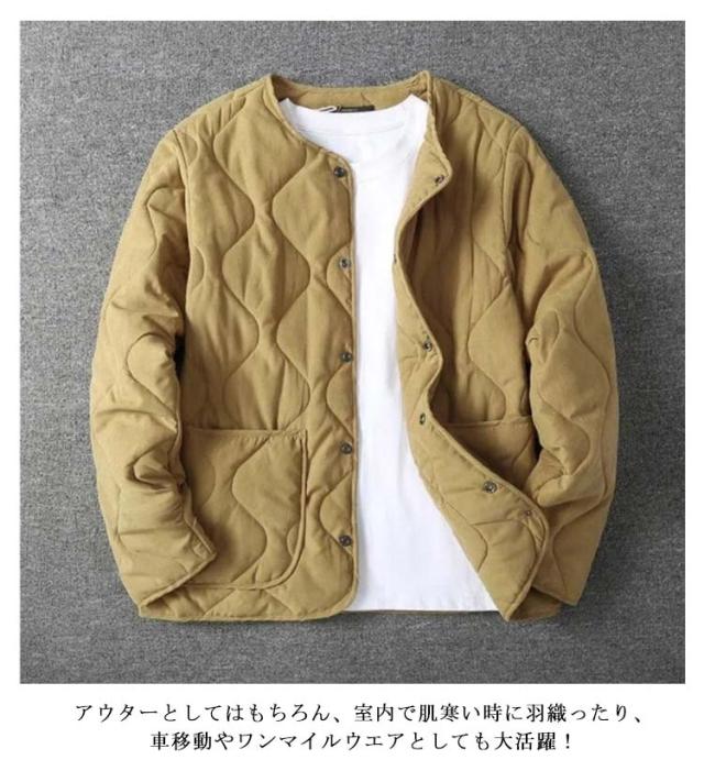 キルティングジャケット メンズ ノーカラー ジャケット 長袖 中綿 ブルゾン キルティング ライナージャケット ノーカラージャケット キルティング ジャケット アウター 上着 ライトアウター 防寒 保温 体型カバー ゆったり 大きいサイズ カーキ ブルー イエロー