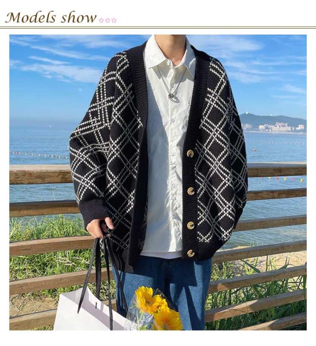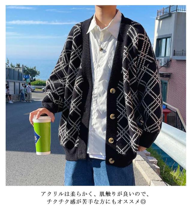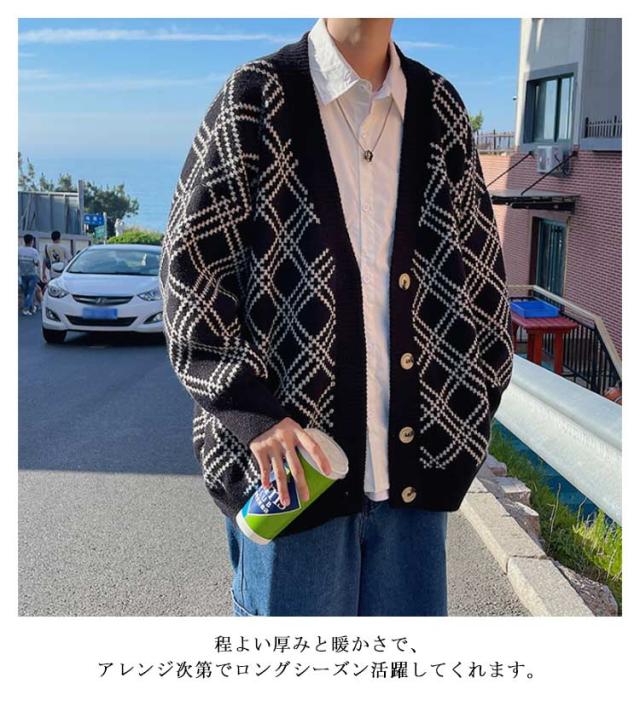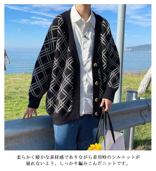 ニット カーディガン チェック柄 総柄 メンズ 秋 冬 厚手 ニットカーディガン Vネック アーガイル柄 ニット カーデ 羽織り アウター オーバーサイズ ルーズ 秋物 秋服 韓国風 ストリート カジュアル おしゃれ シンプル 大きいサイズ ブラック 黒