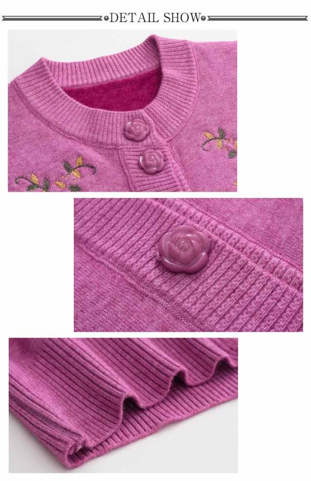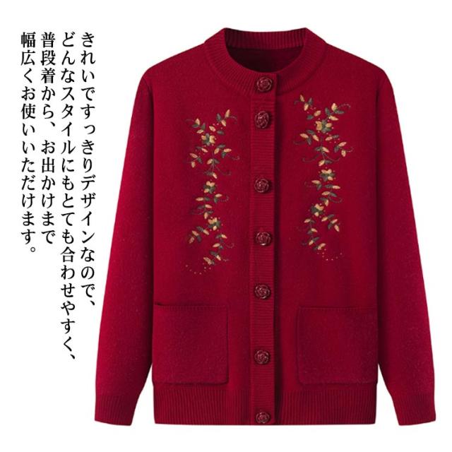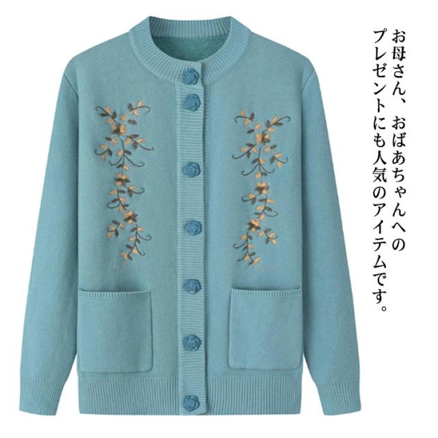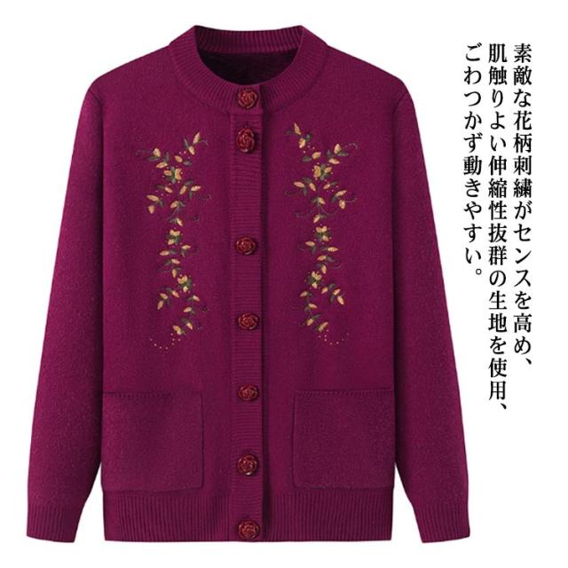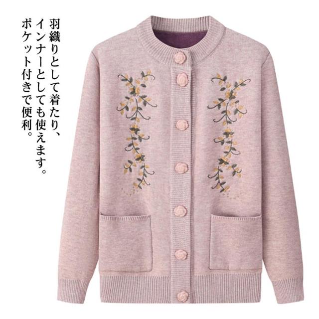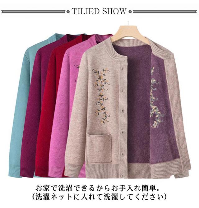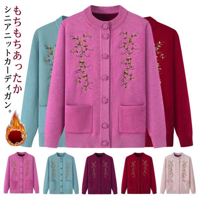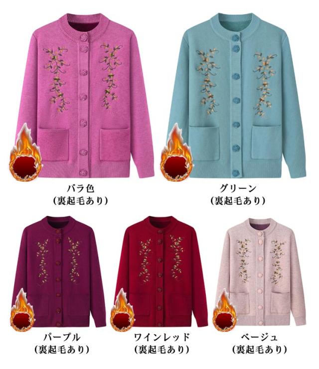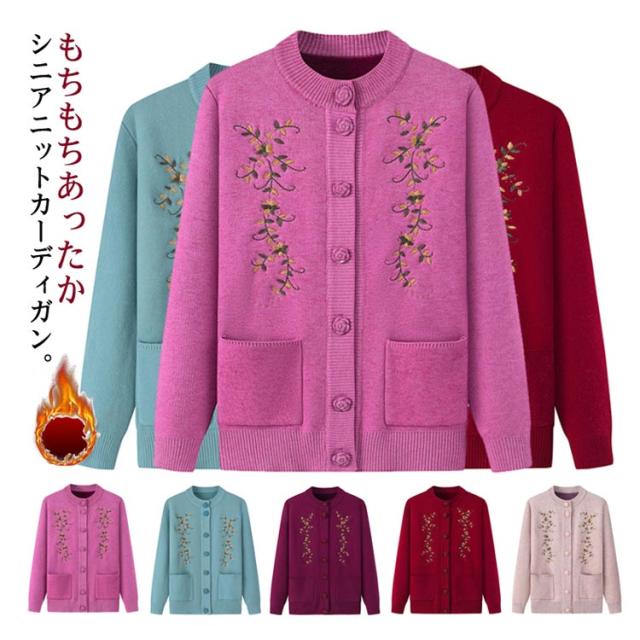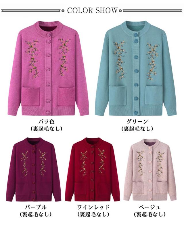 | もちもちあったかシニアニットカーディガン。 裏側はトレンドライクな起毛ニットで、柔らかくてとても暖かい。 なかなか体が温まりにくい高齢者向け秋冬用厚手ニットカーディガン。 素敵な花柄刺繍がセンスを高め、肌触りよい伸縮性抜群の生地を使用、ごわつかず動きやすい。 羽織りとして着たり、インナーとしても使えます。ポケット付きで便利。 きれいですっきりデザインなので、どんなスタイルにもとても合わせやすく、普段着から、お出かけまで幅広くお使いいただけます。 お母さん、おばあちゃんへのプレゼントにも人気のアイテムです。 お家で洗濯できるからお手入れ簡単。(洗濯ネットに入れて洗濯してください) | |