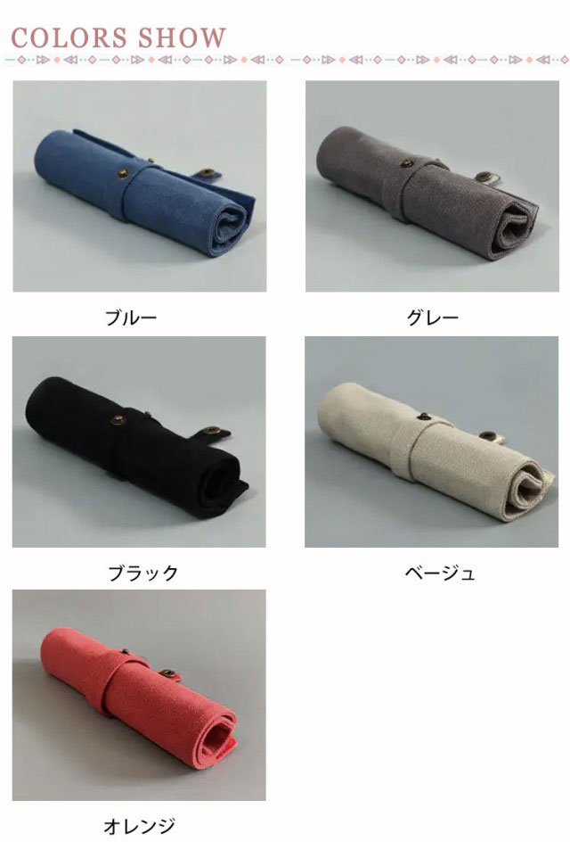 | とってもおしゃれなロールペンケースです。 生地はしっかりとした帆布なので、革製より気楽に使えます。 1本ずつ挿し、クルクルと巻いて使う楽しいロールタイプです。 かわいい存在感のあるペンケースをお探しの方にオススメです。 | |