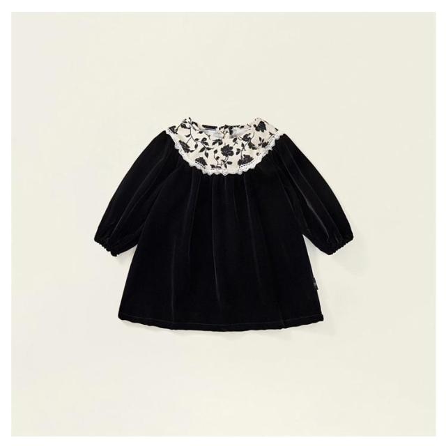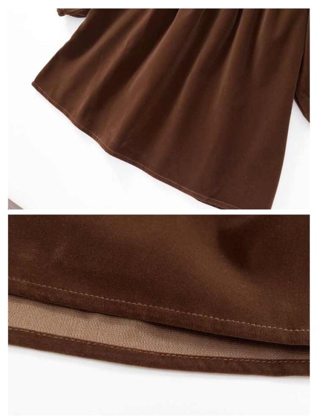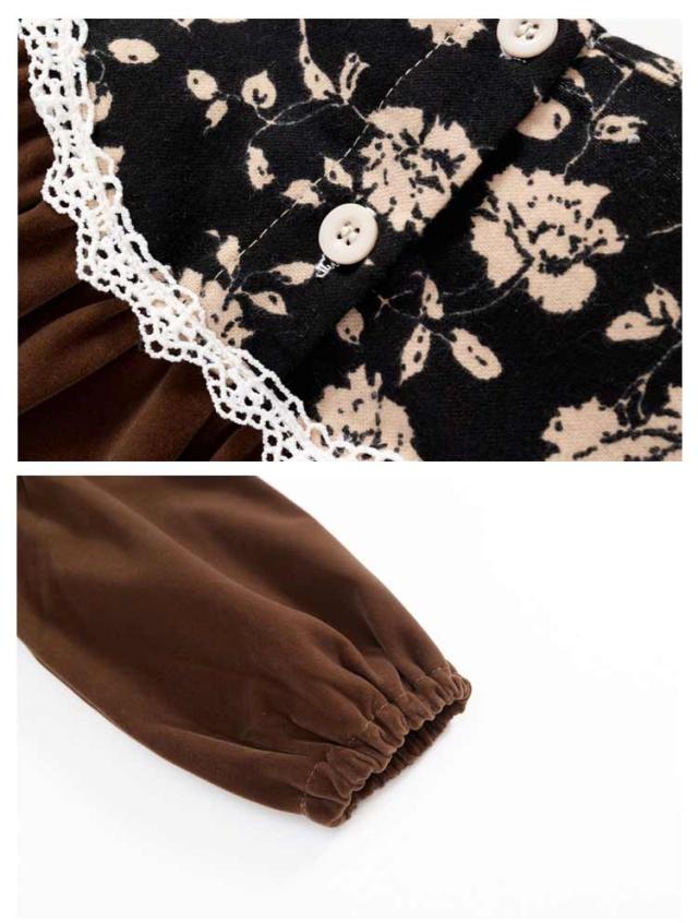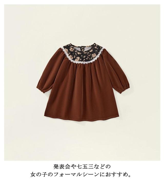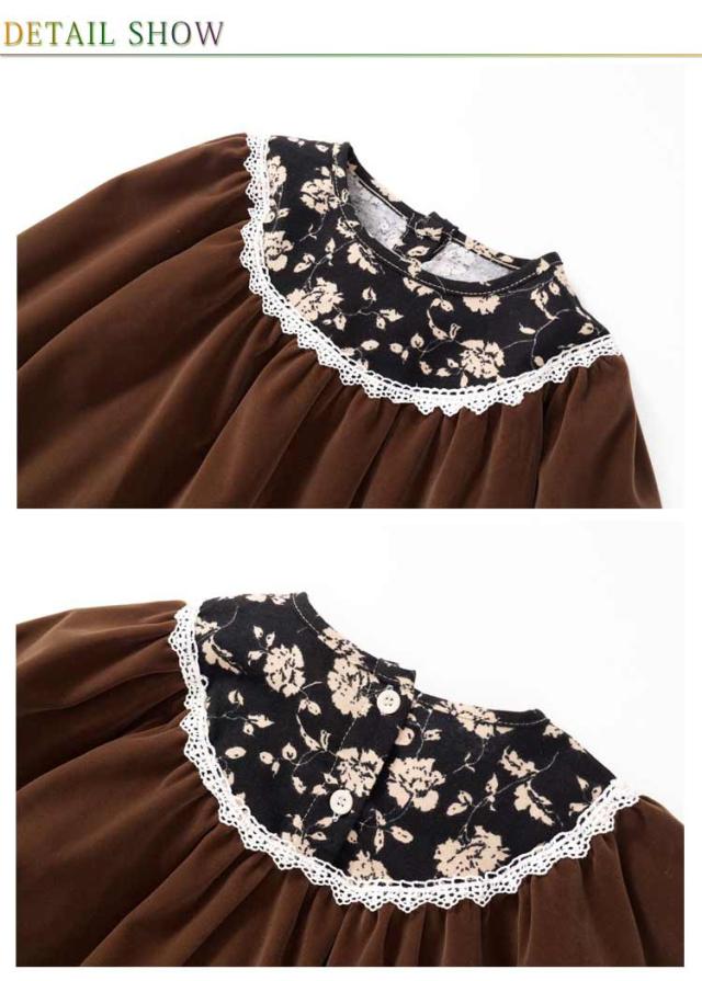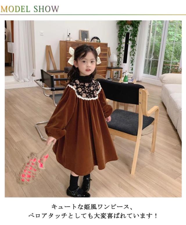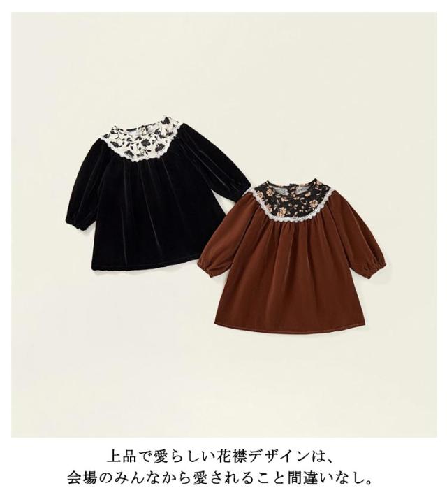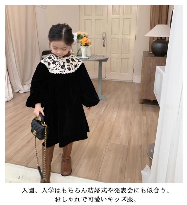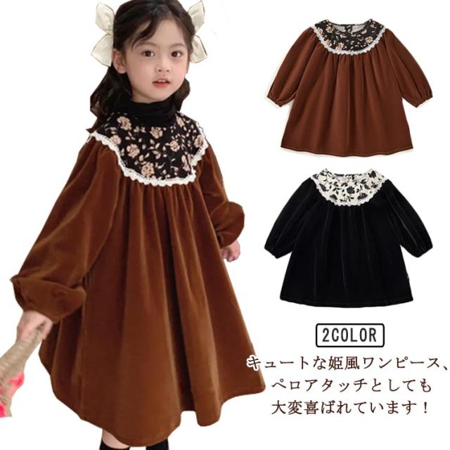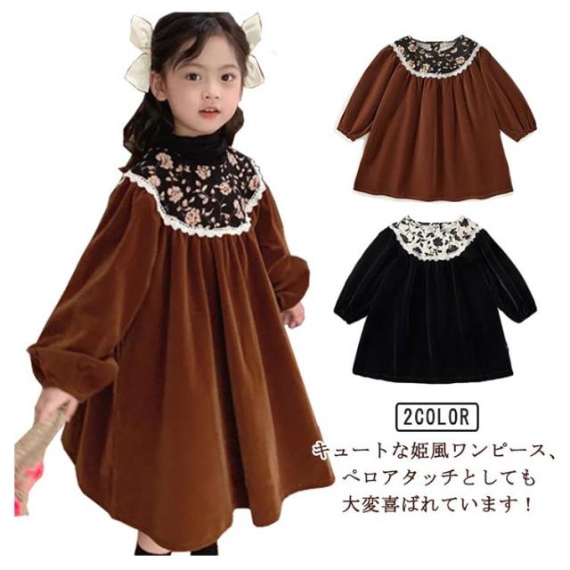 花襟 ベロアワンピース キッズ aライン ワンピース 長袖 女の子 ボリューム袖 バルーンスリーブ 子供服 こども服 子ども服 おしゃれ 通園 通学 おでかけ ガーリー お嬢様 90cm 100cm 110cm 120cm 130cm 140cm
