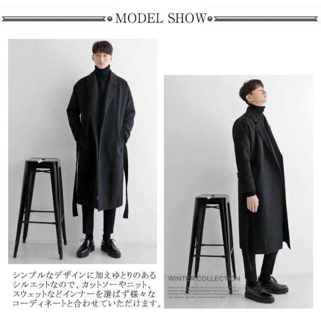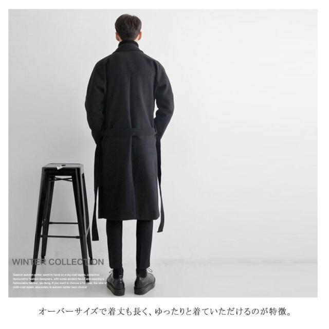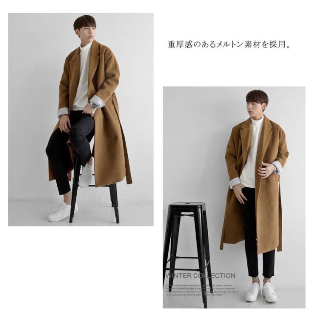 コート メンズ チェスターコート メルトン ロングコート 膝下丈 ベルト付き 秋 冬 キルティング入り 裏キルト 厚手 暖かい 防寒 保温 オーバーサイズ ボタンレス ガウン風 通勤 カジュアル 韓国 ファッション 大きいサイズ ブラック カーキ ベージュ