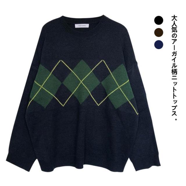 | 大人気のアーガイル柄ニットトップス。 やわらかく手触りの良いニット生地を使用し、暖かみのある印象を与えます。 程度良い開いた首で襟付きのシャツなどのトップスと合わせやすい。 合わせやすい着丈で、スカートやパンツなどあらゆるボトムスと好相性です。 | |