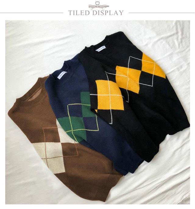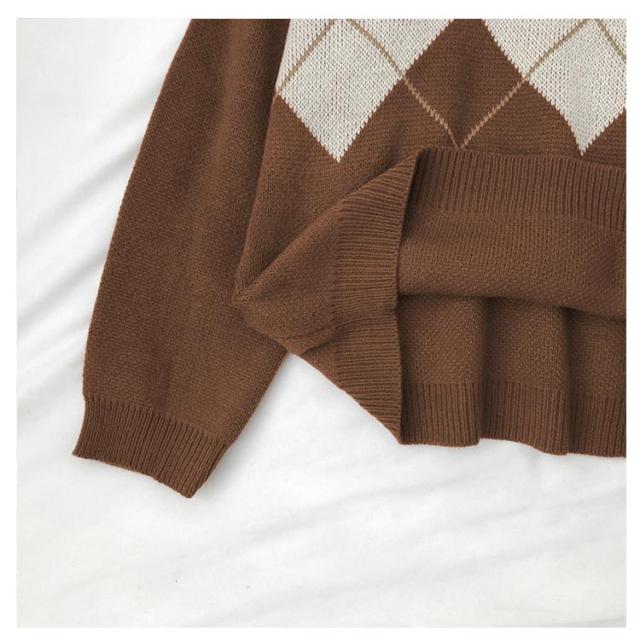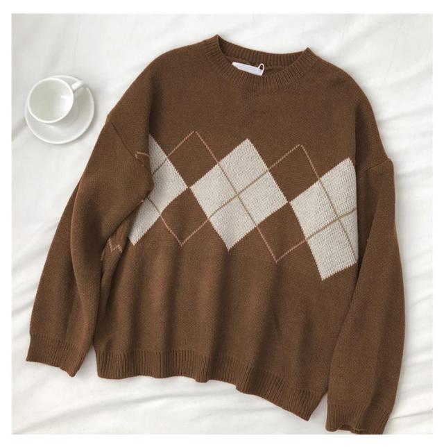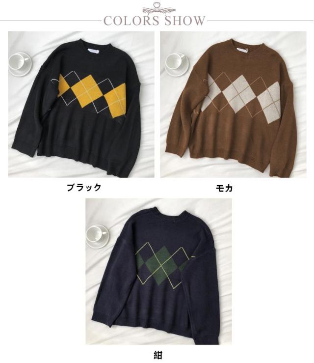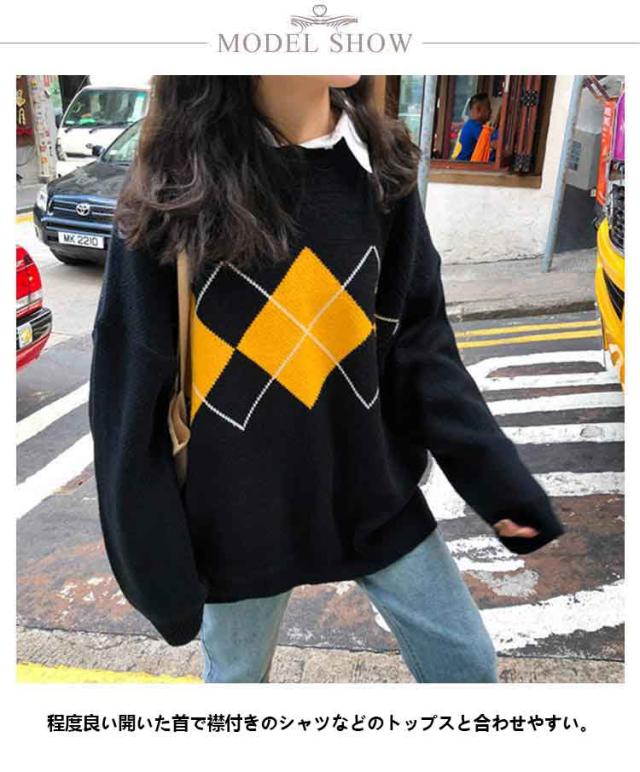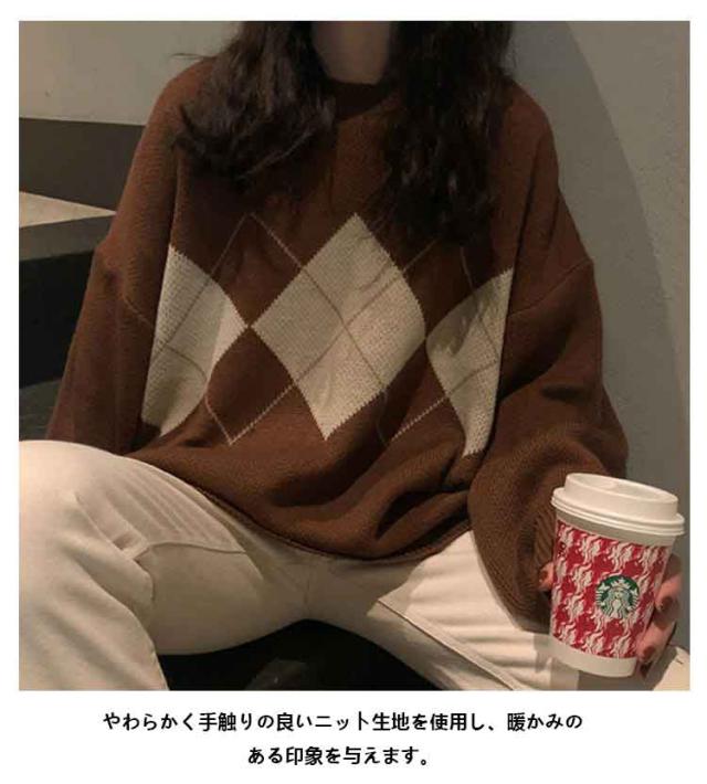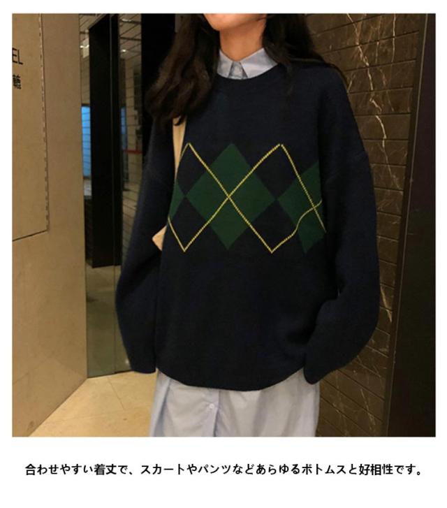 セーター ニット アーガイル柄 秋冬 厚手 トップス 菱柄 幾何学柄 レディース クルーネック プルオーバー ゆったり ニット 長袖 森ガール カジュアル 防寒 冬服