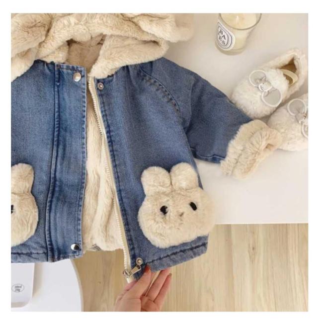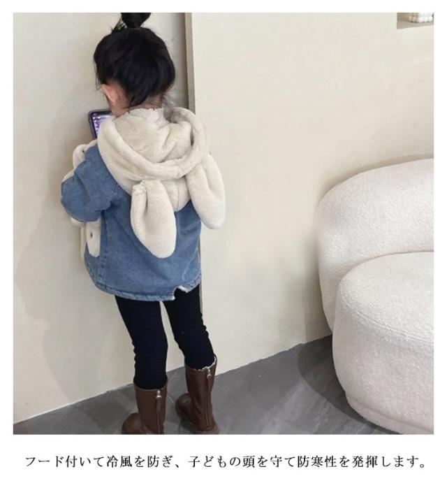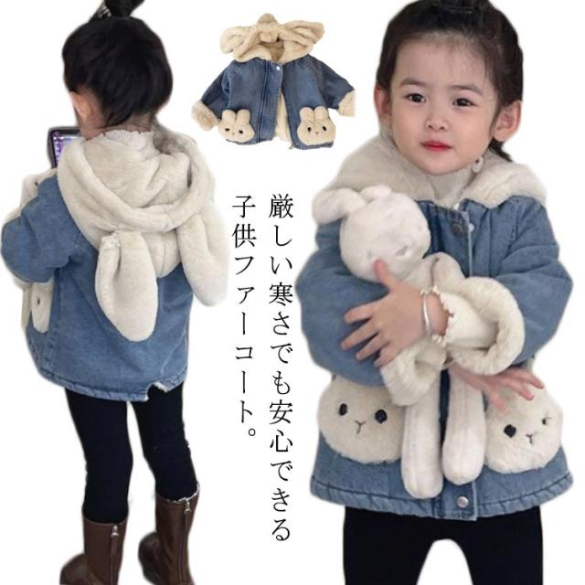 防寒ジャケット ふわふわ コート アウター デニムジャケット ファーコート キッズ服 デニム 長袖 ジャンパー ボアコート 韓国 子供服 ジュニア 帽子付き 女の子 キュート 可愛い もこもこ あったか おしゃれ あたたかい 秋服 冬服 秋冬 通園 アウトドア ウサギ 送料無料