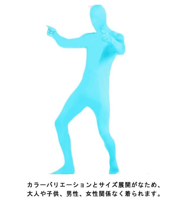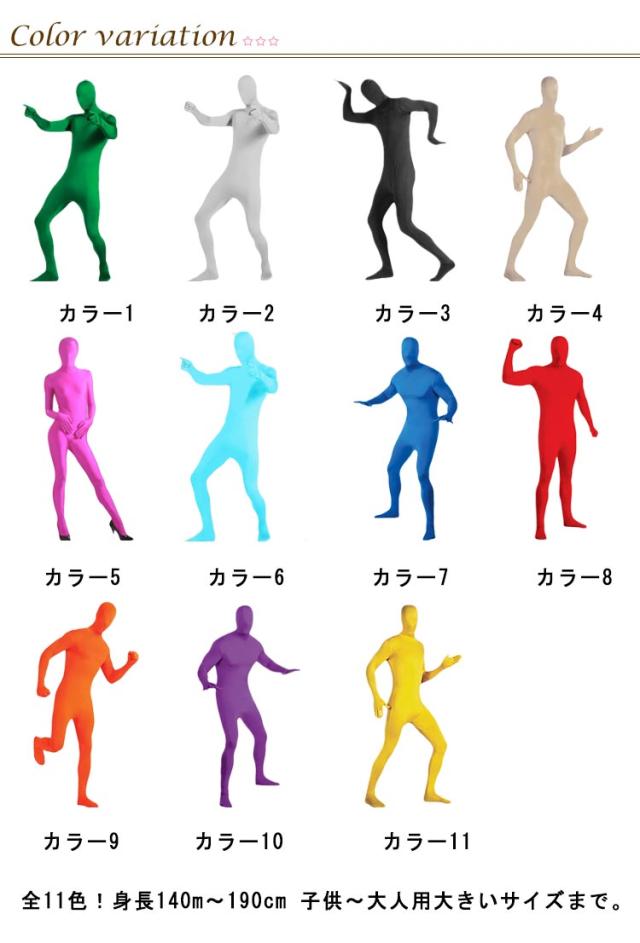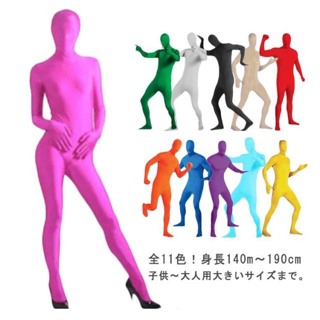 | 全11色!身長140m〜190cm 子供〜大人用大きいサイズまで。 顔まですっぽり覆うタイプの全身タイツ。 カラーバリエーションとサイズ展開が豊富なため、大人や子供、男性、女性関係なく着られます。 薄くて軽い、伸縮性のある素材を使用しているため熱がこもりにくく、快適な着心地。 | |