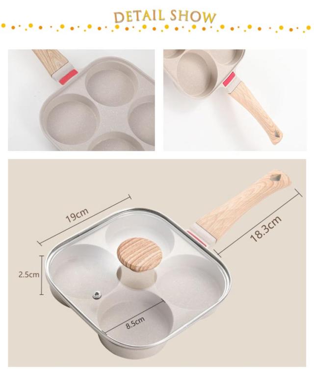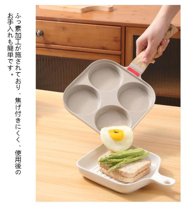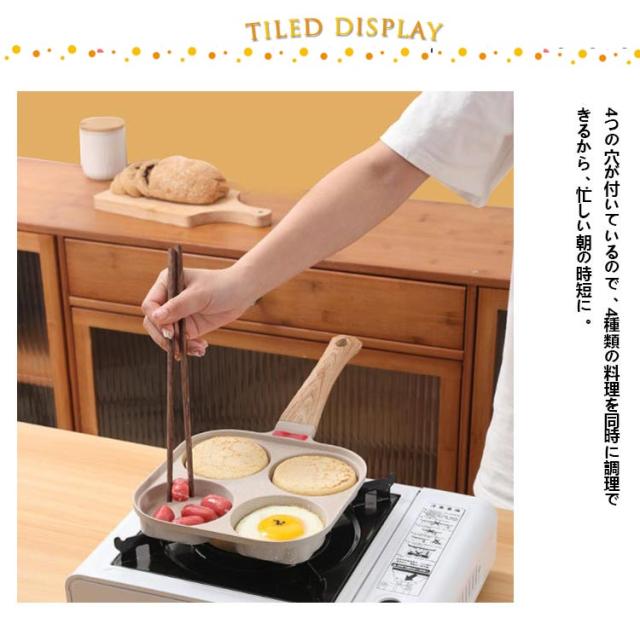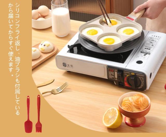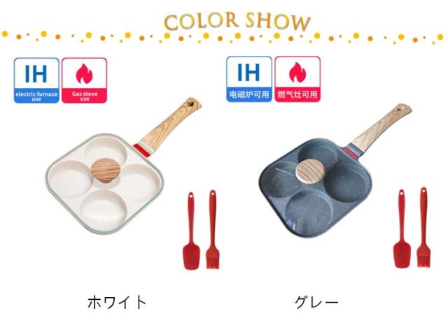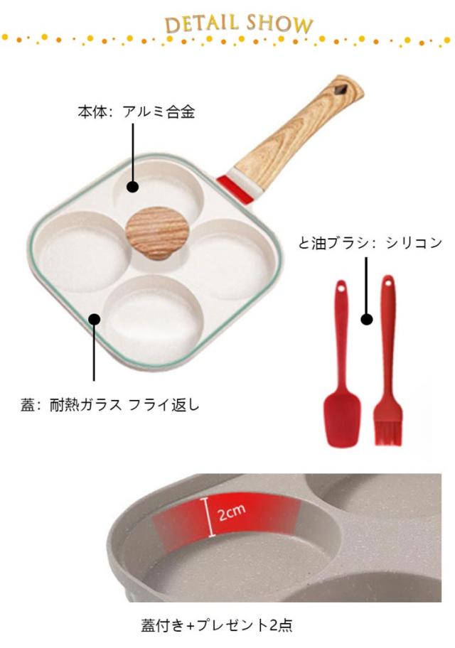 | 【4点セット】 【専用ガラス蓋+フライ返し+油ブラシ】 4つの穴が付いているので、4種類の料理を同時に調理できるから、忙しい朝の時短に。 専用ガラス鍋蓋も付属しているから、調理時間がもっと短めにでき、省エネ。 ふっ素加工が施されており、焦げ付きにくく、使用後のお手入れも簡単です。 IH コンロ セラミックヒーター ガス電磁コイル熱源を選ばず幅広くお使いいただけます。 シリコンフライ返し、油ブラシも付属しているから届いてからすぐ使えます。 | |