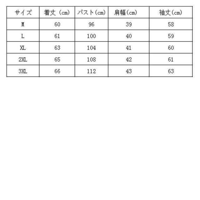 | サイズについての説明 | サイズ 肩幅 バスト 着丈 袖丈 ※サイズ表の実寸法は商品によって1-3cm程度の誤差がある場合がございます。 |