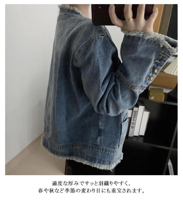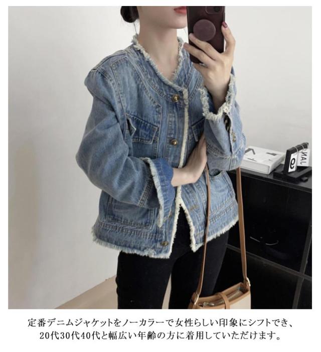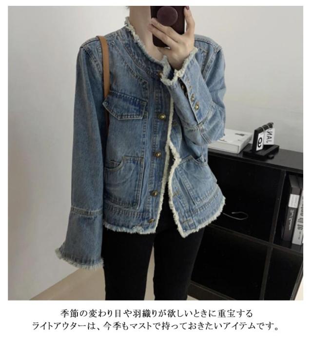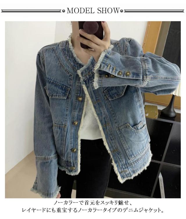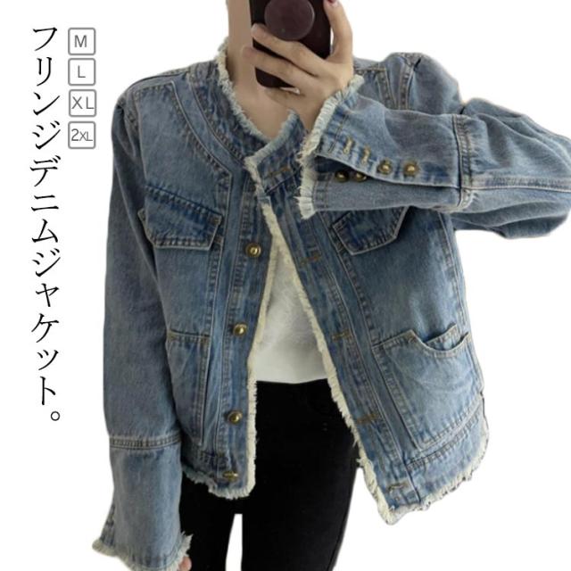 デニムジャケット フリンジデニムジャケット レディース ライトアウター ノーカラー Gジャン フリンジ カットオフ キレイめ 羽織り 大きいサイズ ジージャン アウター クルーネック カジュアル 韓国ファッション デニム