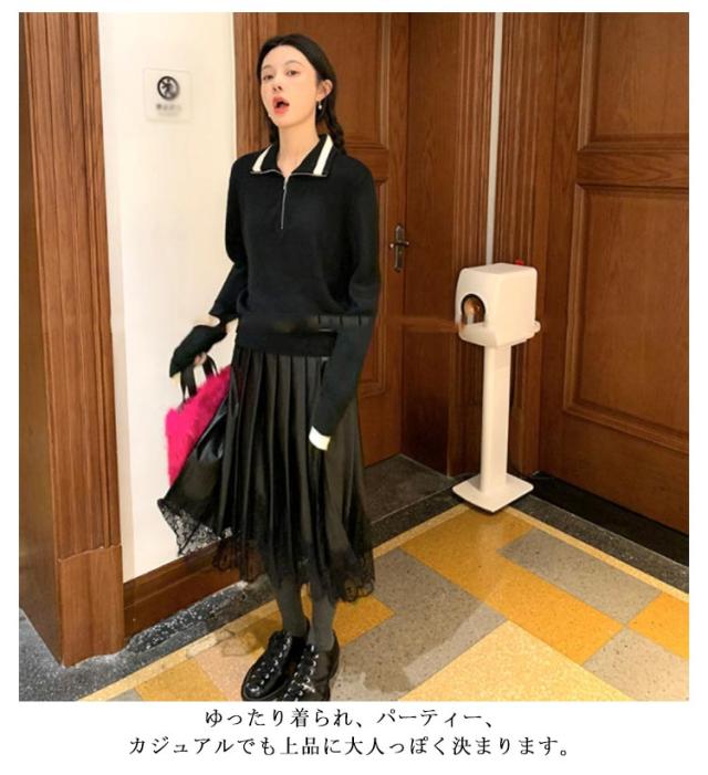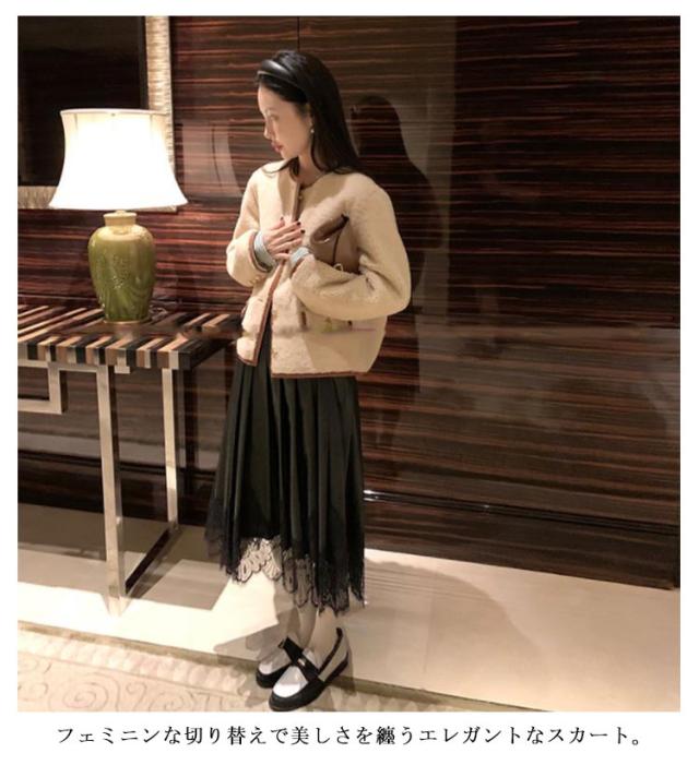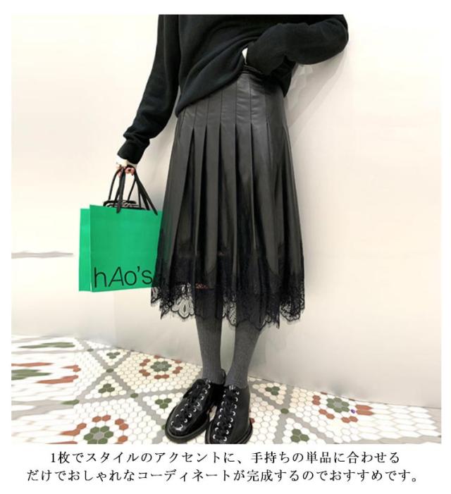 レース切り替え フレアスカート ロング スカート レザースカート プリーツスカート ミモレ丈 Aライン スカート フェミニン ハイウェスト 膝下丈 お呼ばれ エレガント かわいい 秋冬 S M L
