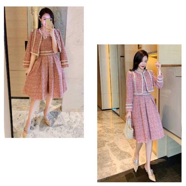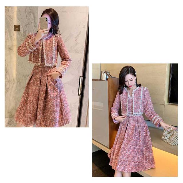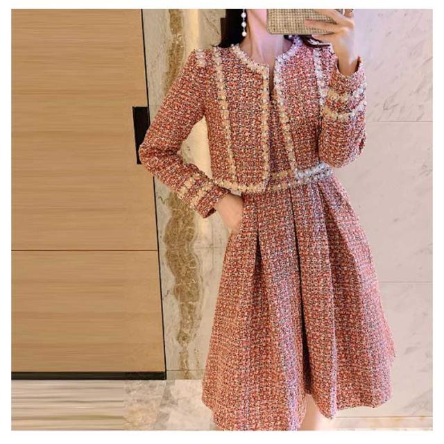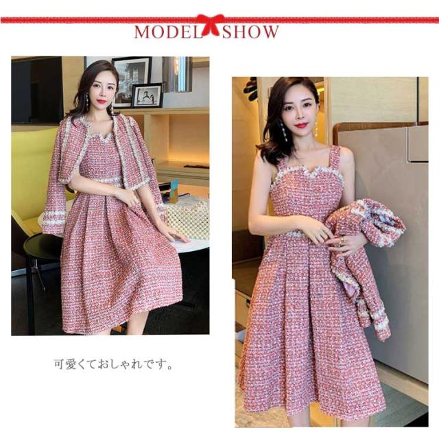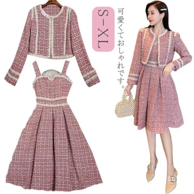 ツイード ワンピース セットアップ 韓国 ジャケット 七五三 ママ おしゃれ 母親 服装 親 スーツ 同窓会ドレス 卒業式 入学式 卒園式 入園式 成人式 セレモニーワンピース 春 秋 冬 長袖 レディース ジャンパースカート ジャンスカ パール ロング ピンク 80年代風