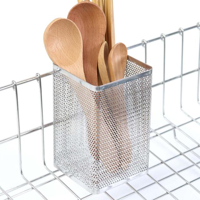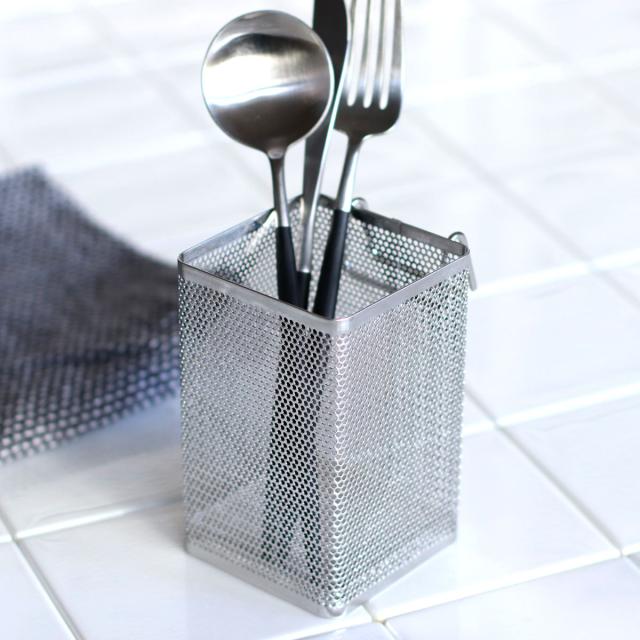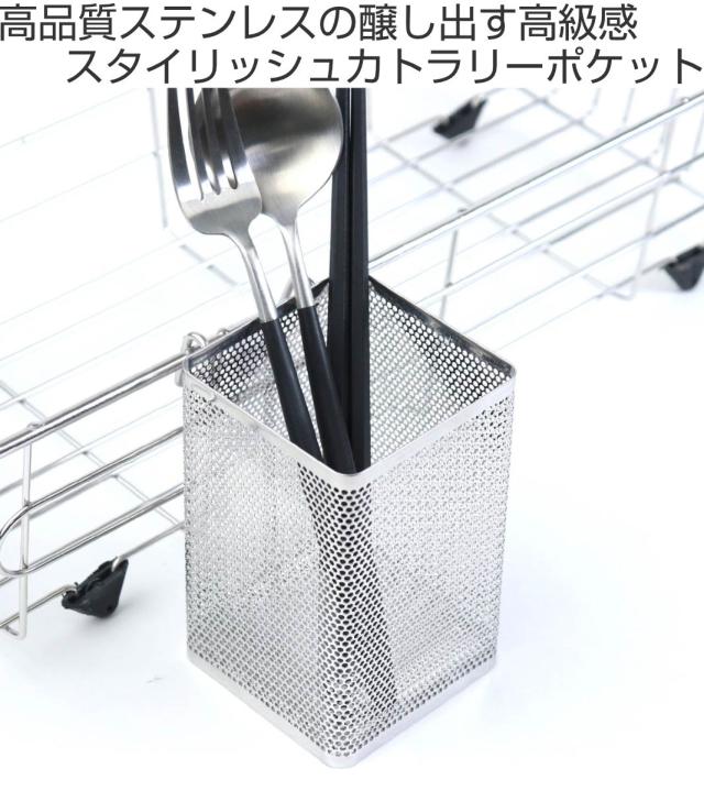 カトラリーを立てて水切りできる、ステンレス製のカトラリーポケットです。お手持ちの水切りカゴに引っ掛けて、水切り環境をすっきり快適に。シンプルなデザインなので、様々な水切りカゴとの相性も良く、使いやすいです。