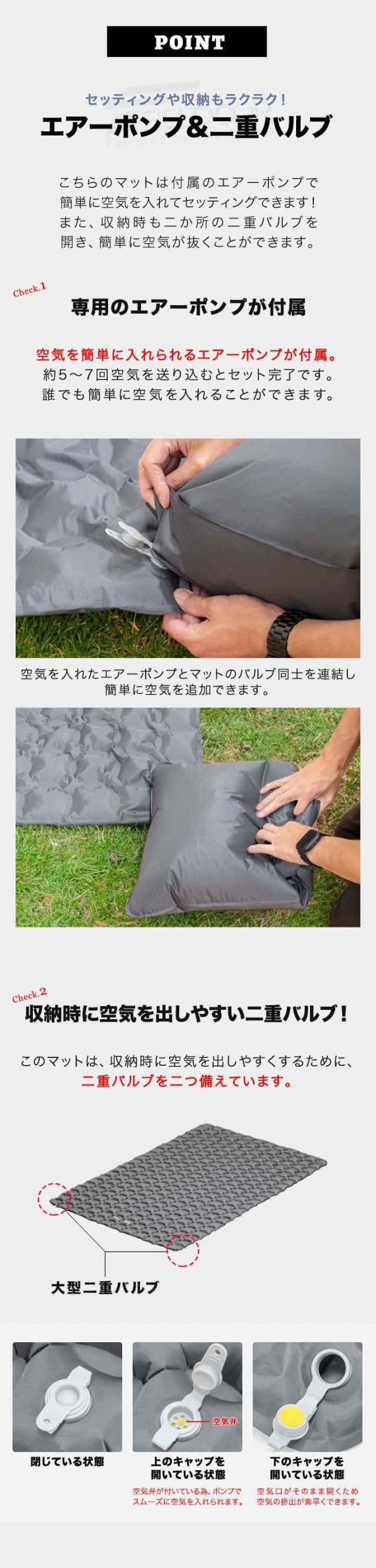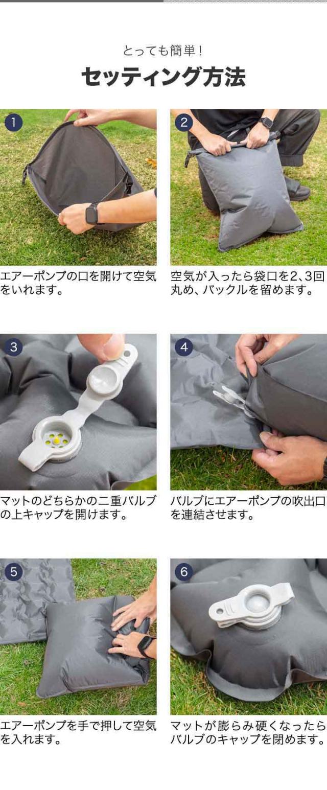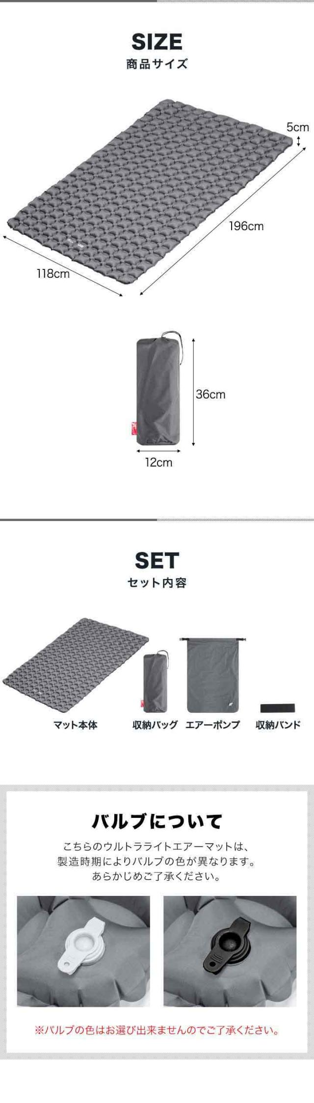 | セット内容: マット本体×1 / エアーポンプ×1 / 収納バッグ×1 / 収納バンド×1 |