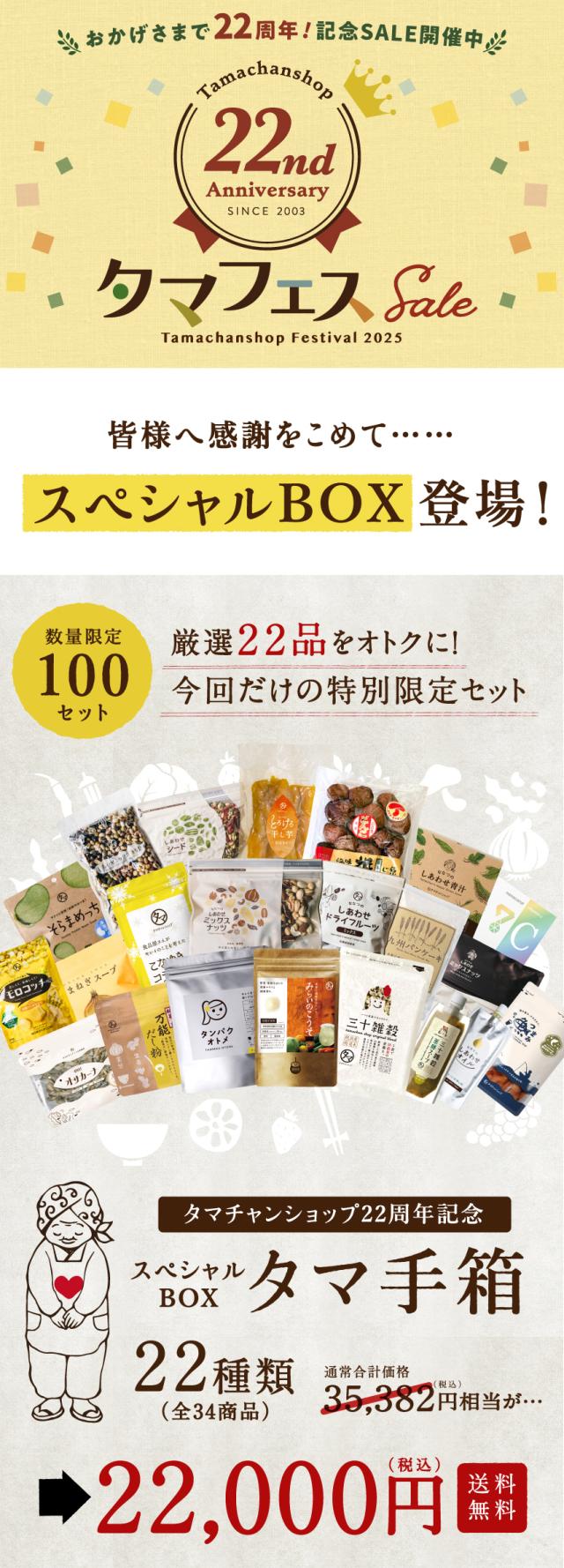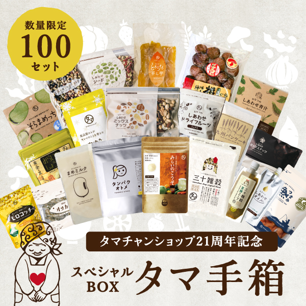 22周年記念スペシャルBOXタマ手箱 100セット限定■ 32,802円相当が19,800円!21アイテム(全点)お一人様1セット タンパクオトメ しょうが ミックスナッツ 煎り豆 シード 三十雑穀 スープ パンケーキ オサカーナ 干し芋 オイル
