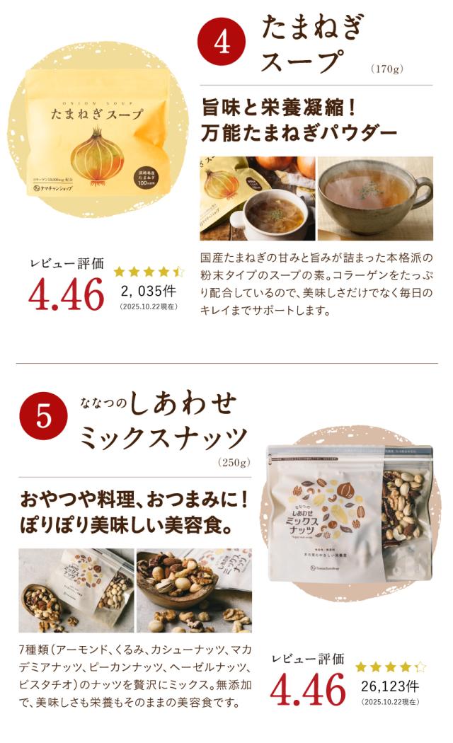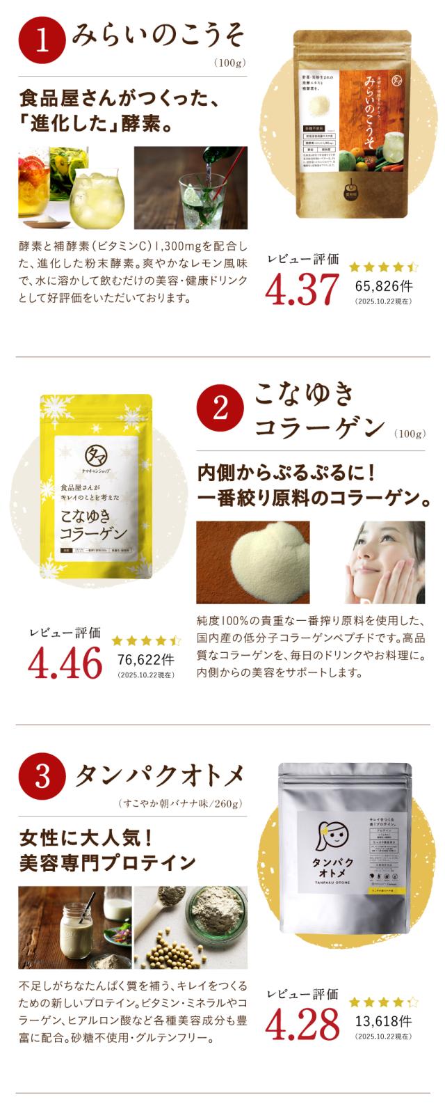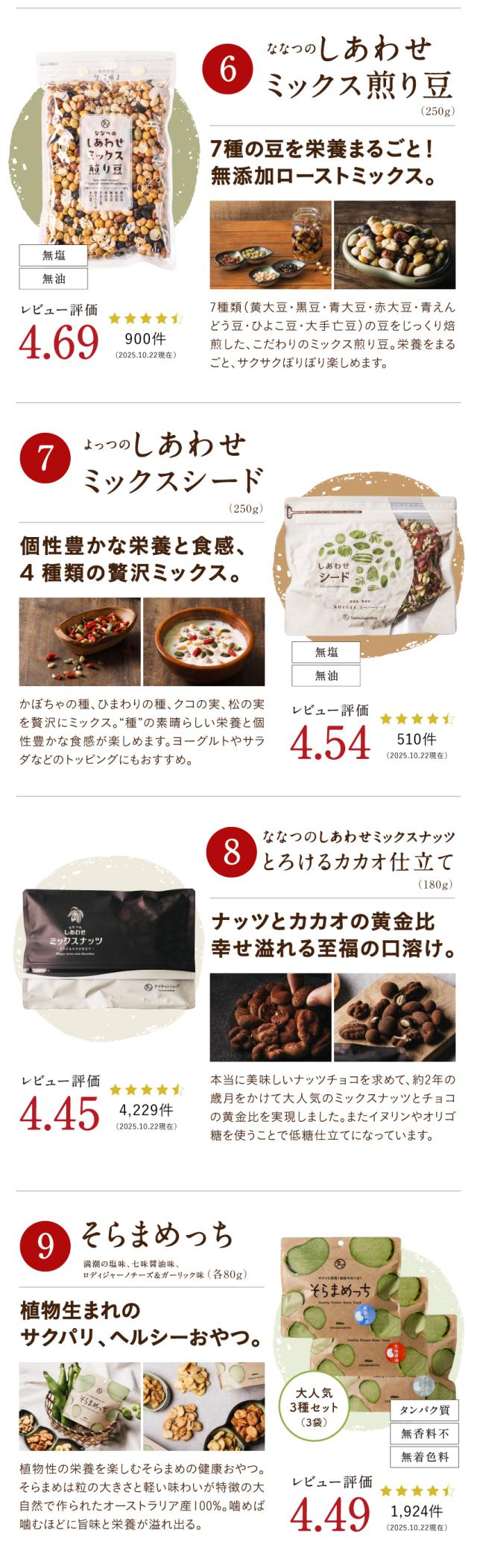 みらいのこうそ 100g、こなゆきコラーゲン 100g、タンパクオトメ 260g(朝バナナ)、たまねぎスープ、ななつのしあわせミックスナッツ 250g(無塩)、ななつのしあわせミックス煎り豆 250g、よっつのしあわせミックスシード 250g、ななつのしあわせミックスナッツカカオ仕立て、そらまめっち(満潮の塩、七味醤油、チーズ&ガーリック)、三十雑穀 300g(白)、三十雑穀薬膳スープ 170g、ドライフルーツミックス、九州パンケーキ 200g(プレーン)、乾しいたけ 100g(TD100)、OH!オサカーナ(ごまいりことアーモンド、昆布ミックス、アンチョビガーリック、シーフードミックス、熟成チーズミックス、わさび仕立て、卑弥呼醤油バター)、ななつのしあわせ青汁1箱、紅はるか干し芋、ななつのしあわせオイル、万能だし粉、モロコッチ3袋セット、漁つまみ(むしりたら、ソフトあたりめ、柔らかサーモン)
