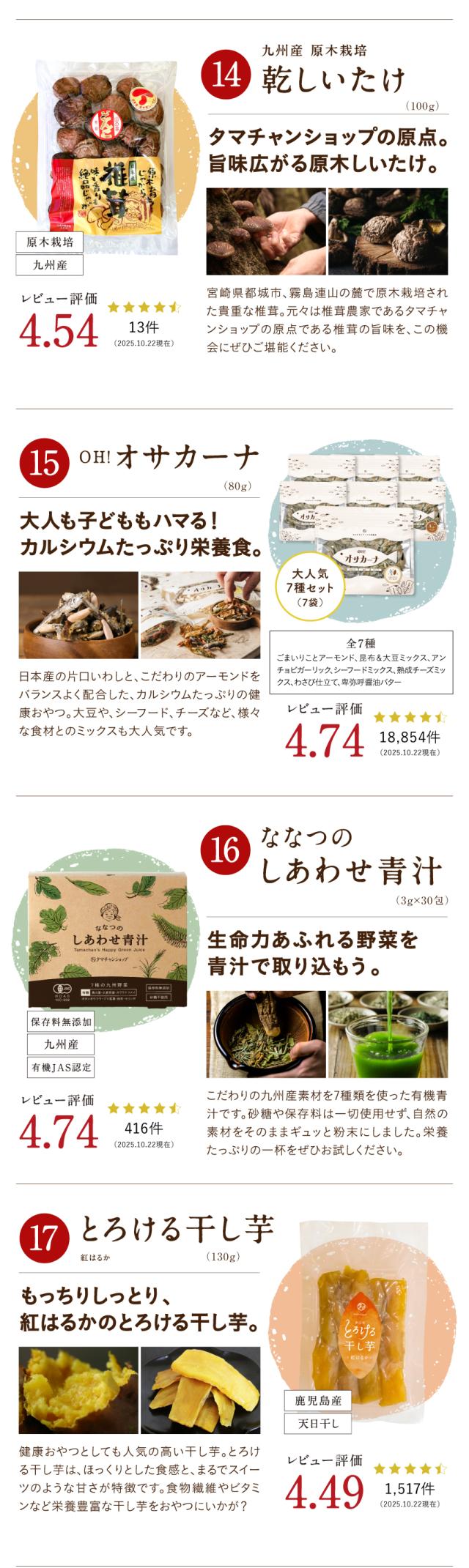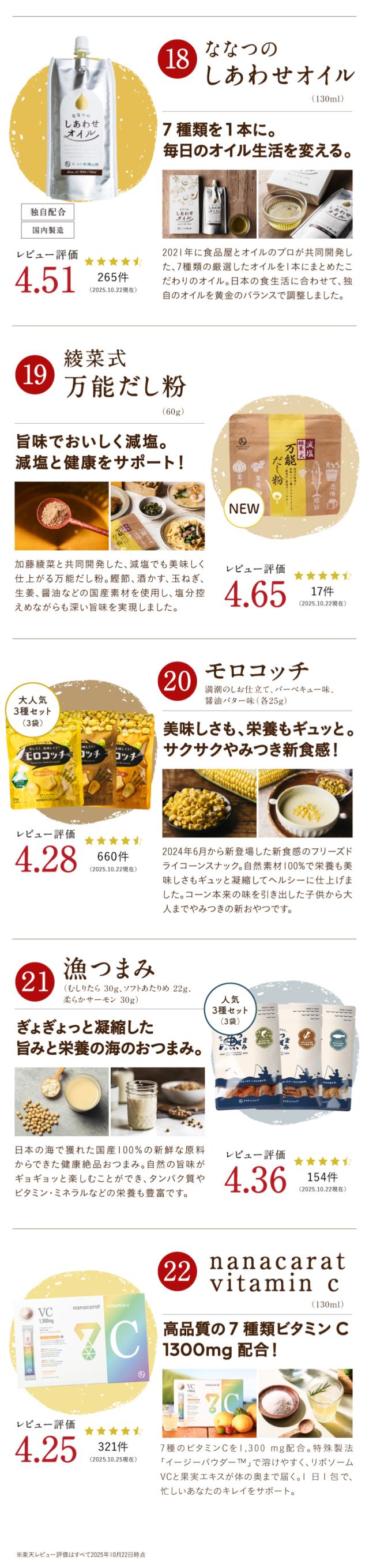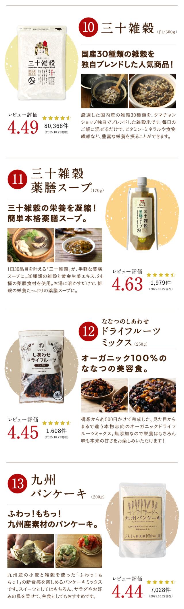 みらいのこうそ 100g、こなゆきコラーゲン 100g、タンパクオトメ 260g(朝バナナ)、たまねぎスープ、ななつのしあわせミックスナッツ 250g(無塩)、ななつのしあわせミックス煎り豆 250g、よっつのしあわせミックスシード 250g、ななつのしあわせミックスナッツカカオ仕立て、そらまめっち(満潮の塩、七味醤油、チーズ&ガーリック)、三十雑穀 300g(白)、三十雑穀薬膳スープ 170g、ドライフルーツミックス、九州パンケーキ 200g(プレーン)、乾しいたけ 100g(TD100)、OH!オサカーナ(ごまいりことアーモンド、昆布ミックス、アンチョビガーリック、シーフードミックス、熟成チーズミックス、わさび仕立て、卑弥呼醤油バター)、ななつのしあわせ青汁1箱、紅はるか干し芋、ななつのしあわせオイル、万能だし粉、モロコッチ3袋セット、漁つまみ(むしりたら、ソフトあたりめ、柔らかサーモン)