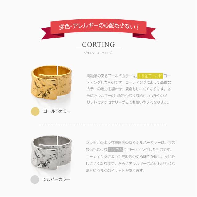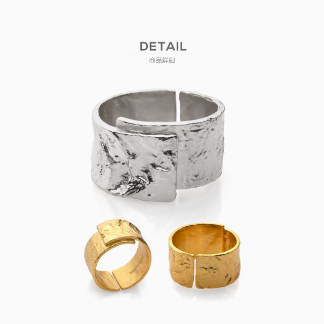 シンプルなデザインに凹凸と重なりのデザイン性を付けたシルバーリングです。幅広の存在感のある指輪で、凹凸があることで、シンプルな表面に表情がでています。素材は、しっかりとした作りでシルバー925(銀製)で作られています。K18(18金ゴールド)、ロジウムコートでプラチナ仕上げをしたジュエリーコーティングで上質なシルバー925をコーティングしているので、変色しにくく、アレルギーの心配も少なく使いやすい仕様です。裏側にはスリットが入っているので、完全な輪ではないフリーサイズリングとして多少のサイズ調節ができます。※装着の度に調節は行わず、調整は初回装着時のみにして下さい。繰り返しサイズ調整されますと破損の原因となります。