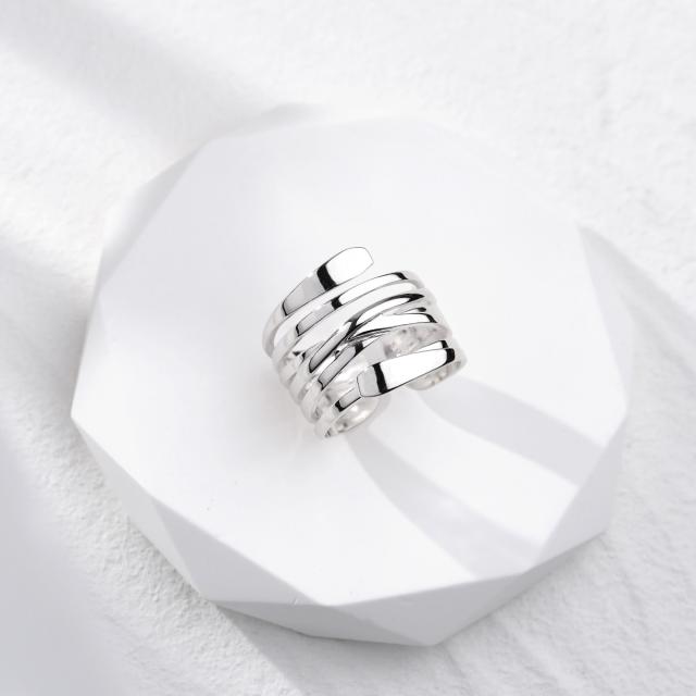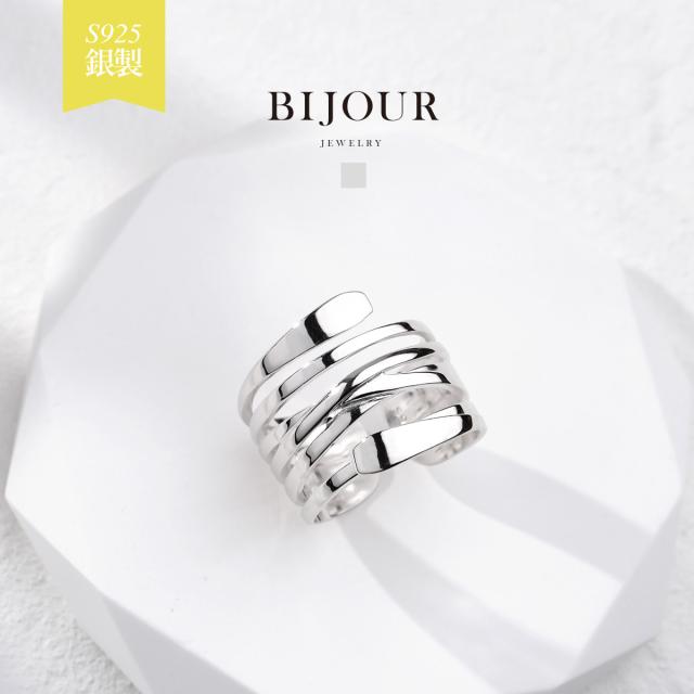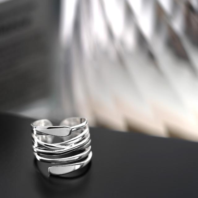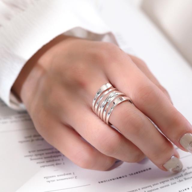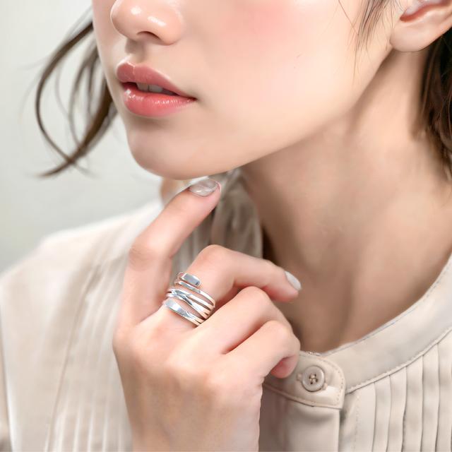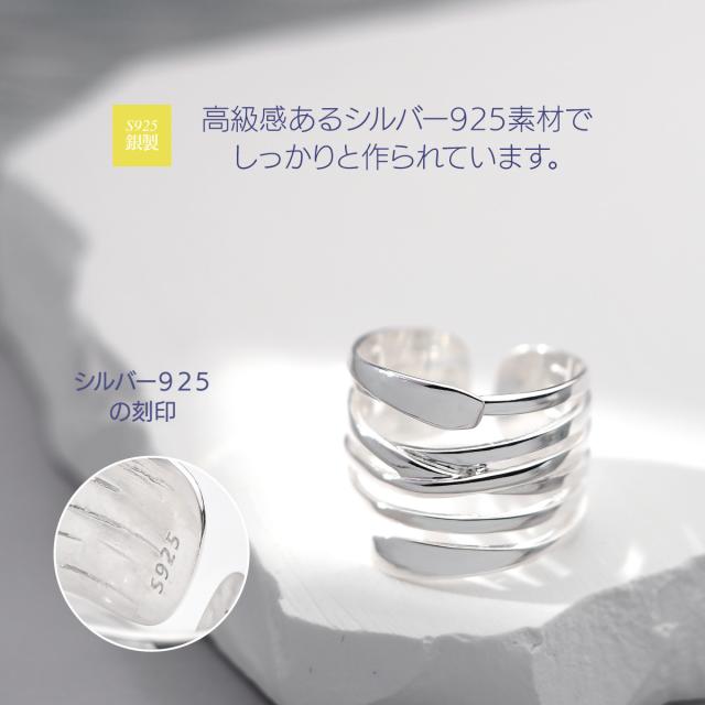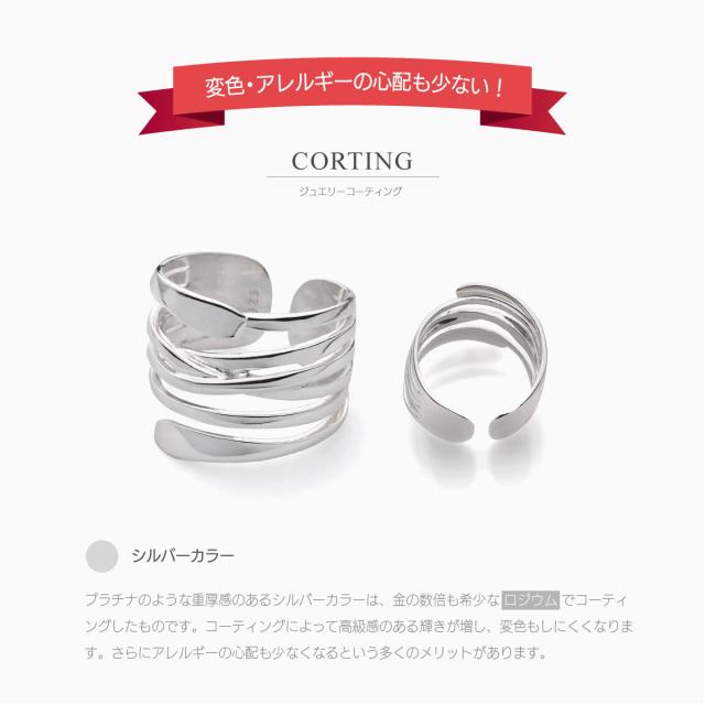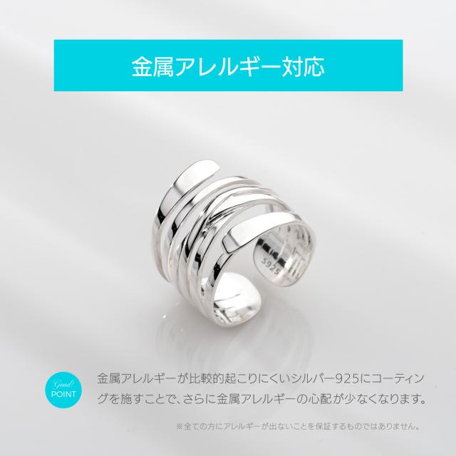 いくつもの紐を巻いたようなユニークで斬新なデザインのシルバーリングです。幅のある大ぶりな指輪ですが、隙間が多くあるデザインなので、重さを感じさせない印象。素材は、しっかりとした作りでシルバー925(銀製)で作られています。ロジウムコートでプラチナ仕上げをしたジュエリーコーティングで上質なシルバー925をコーティングしているので、変色しにくく、アレルギーの心配も少なく使いやすい仕様です。裏側にはスリットが入っているので、完全な輪ではないフリーサイズリングとして多少のサイズ調節ができます。※装着の度に調節は行わず、調整は初回装着時のみにして下さい。繰り返しサイズ調整されますと破損の原因となります。
