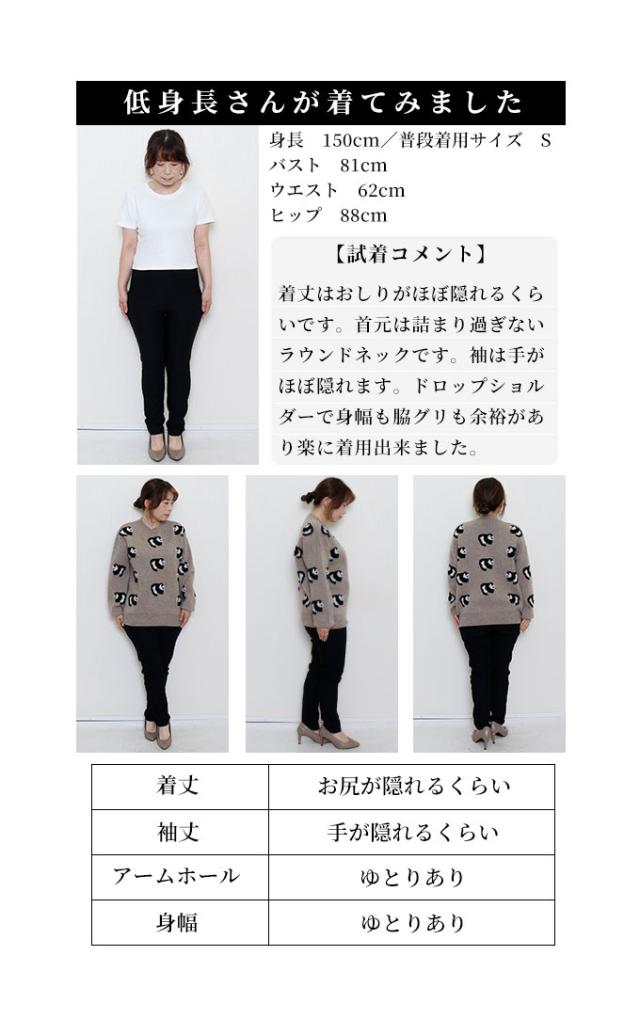 着丈はおしりがほぼ隠れるくらいです。首元は詰まり過ぎないラウンドネックです。袖は手がほぼ隠れます。ドロップショルダーで身幅も脇グリも余裕があり楽に着用出来ました。目の詰まったニットで温かく、パンダが編み込まれてて少しモコモコしててとても可愛いです。肌触りも良かったです。