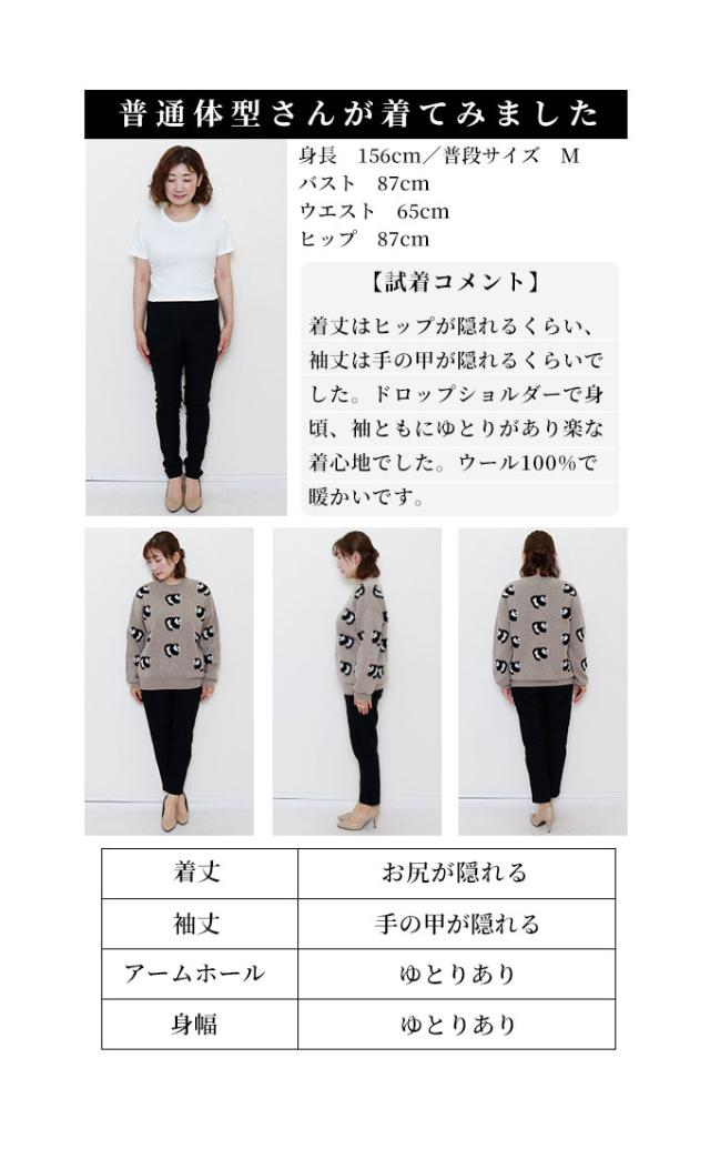 着丈はヒップが隠れるくらい、袖丈は手の甲が隠れるくらいでした。ドロップショルダーで、身頃、袖ともにゆとりがあり楽な着心地でした。ウール100%で暖かいです。ベーシックな形のクルーネックニットです。ニット全体に、モコモコしたパンダがたくさんあしらわれていて可愛いです。チクチク感は気になりませんでした。