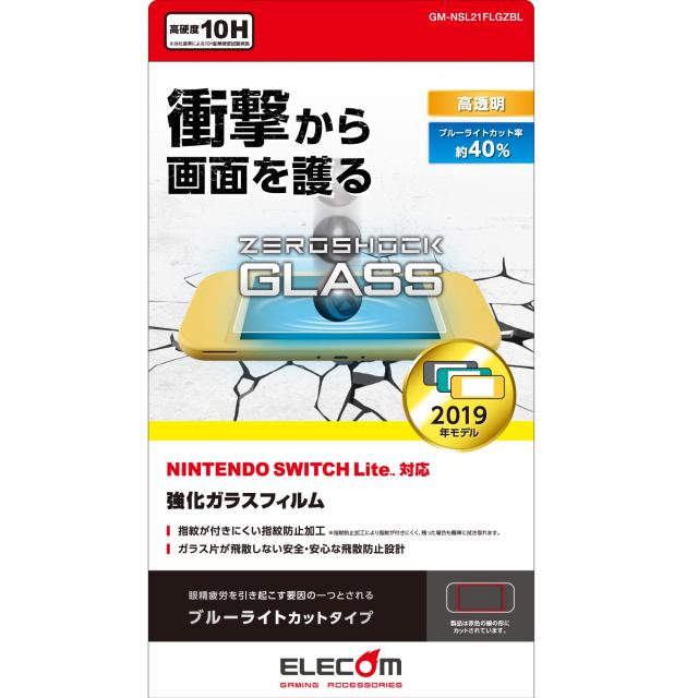 詳しくは商品の仕様商品の説明をご確認ください。<br>特殊な衝撃吸収層を採用し、衝撃から画面を護るブルーライトカットタイプのNINTENDO SWITCH(TM) Lite用液晶保護ガラスです。<br>ガラスに100cmの高さから150gの鉄球を落とす実験で、従来品ではガラスパネルが破損したのに対し、本製品はガラスパネルを守る結果となりました。※当社試験結果より<br>※当社によるガラスへの硬球落下試験結果(実力値)より。実力値であり値ではありません。<br>液晶ディスプレイが発する光の中の青い部分ブルーライトを約40%カットします。<br>◆商品名:エレコム Nintendo Switch Lite専用 液晶保護フィルム ZEROSHOCKガラス ブルーライトカット GM-NSL21FLGZBL<br>色名:2) Switch Lite 専用 | スタイル:ZEROSHOCKガラス / ブルーライトカット 【 仕様 】■ 対応機種:NINTENDO SWITCH(TM) Lite■ 材質:接合面:シリコン、外側:ガラス、PET■ セット内容:液晶保護ガラス(ZEROSHOCK、ブルーライトカット仕様)×1、ホコリ取りシール×1、クリーニングクロス×1【 説明 】■ 特殊な衝撃吸収層を採用し、衝撃から画面を護るブルーライトカットタイプのNINTENDO SWITCH(TM) Lite用液晶保護ガラスです。■ ガラスに100cmの高さから150gの鉄球を落とす実験で、従来品ではガラスパネルが破損したのに対し、本製品はガラスパネルを守る結果となりました。※当社試験結果より■ ※当社によるガラスへの硬球落下試験結果(実力値)より。実力値であり値ではありません。■ 液晶ディスプレイが発する光の中の青い部分ブルーライトを約40%カットします。■ ※ブルーライトは目の角膜や水晶体で吸収されずに網膜まで到達し、網膜の機能低下を引き起こす場合があると言われています。■ 表面硬度10Hの強化ガラス採用により、保護ガラス表面のキズを防止します。※当社基準による10H鉛筆硬度試験での実力値です。■ 貼り付け面にシリコン皮膜をコーティングし、接着剤や両面テープを使わずに貼り付け可能な自己吸着タイプです。貼りやすく、貼り直しも可能です。■ 時間の経過とともに気泡が目立たなくなる特殊吸着層を採用したエアーレスタイプです。■ 指紋・皮脂汚れが付きにくく、残った場合でも簡単に拭き取れる指紋防止加工を施しています。■ 握ったときやカバンから取り出すときにも引っかかりにくいように、エッジに丸みをもたせたラウンドエッジ加工を施しています。■ 端末の形状に合わせたサイズにカット済みなので、パッケージから取り出してすぐに使用可能です。■ フィルムを貼ったままでも本体操作ができるタッチスクリ ーン入力に対応しています。■ 特殊な飛散防止設計により、万一割れてしまった際にもガラス片が飛散することなく、高い安全性を実現しています。【商品に関する】エレコム総合インフォメーションセンターTEL. 0570-084-465FAX. 0570-050-012受付時間 / 10:00~19:00 年中無休
