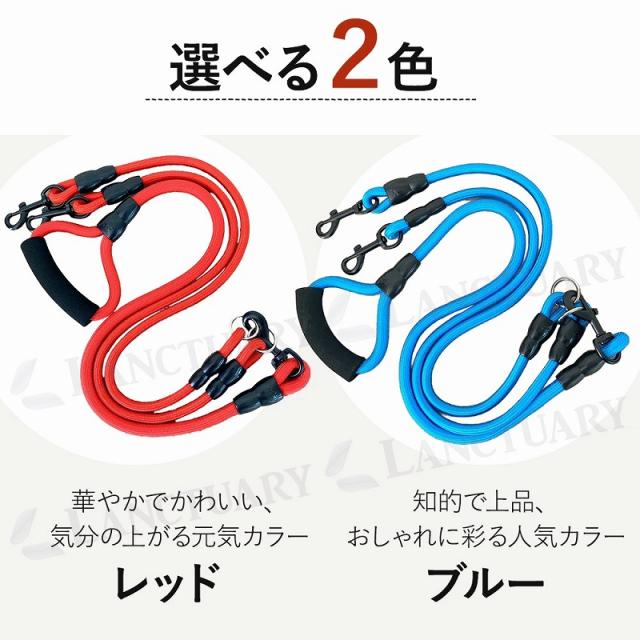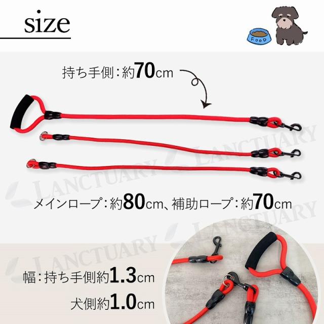 | 主な仕様 | 【カラー】 レッド、ブルー 【サイズ】 全長:約145cm (持ち手側:約70cm、メインロープ:約80cm、補助ロープ:約70cm) 幅:持ち手側約1.3cm、犬側約1.0cm 【素材】 ナイロン 【耐荷重】 約60kgまで |