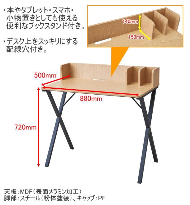 本体:(約)幅880×奥行500×高さ860mm 板厚:(約)15mm 天板上部までの高さ:(約)720mm ブックスタンド:(約)高さ140×奥行150mm |