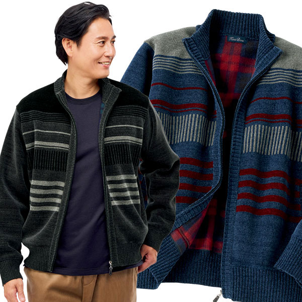 裏チェックフルジップニット スタイリッシュコーディネート メンズ 秋冬春 40代 50代 60代 958130
