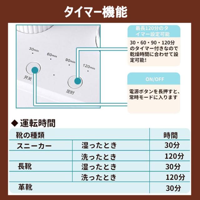 ・【タイマー機能搭載】このくつ乾燥機は、異なる種類の靴に対して異なる作業時間(30/60/90/120分の設定)を設定することができます。異なるニーズに応じて作業時間を設定することができます。