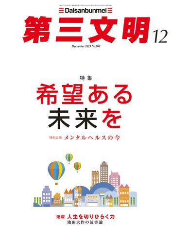 『第三文明』2023年12月号 【特集】〈希望ある未来を〉認知症でも自分らしく輝ける社会を目指して 永田久美子/学校給食の無償化で子どもの成長を支える 鳫咲子/[対談]"徹して1人のために"——これこそが公明党の持ち味 水谷 修×いぬかい明佳/【特別企画】〈メンタルヘルスの今〉自分と家族を守る心のケア 大美賀直子/早期発見・早期治療のために 井上智介/[コラム]相談先の選び方・休息の取り方/【インタビュー】日常を忘れて大人のおとぎ話を楽しんでほしい 映画『翔んで埼玉〜琵琶湖より愛をこめて〜』 片岡愛之助/自公連立政権での公明党の存在意義 藪野祐三/日本がとるべき国連外交の進路 滝澤三郎/[ルポ]必要な患者に必要な薬が届くような法改正を 大麻由来の医薬品の現状と今後/[寄稿]共産党関連団体でも「排除の論理」が横行 柳原滋雄/【TOPIC】「人間ゲーテを語る」20周年記念講義を創価大学で実施/命を奪う者への怒り。それは、平和を求めるロック・スピリット BORO/ギタリストMOMO 世界一に輝く/【連載記事】《希望の源泉・池田思想を読み解く*佐藤優》(89)桜梅桃李の菩薩像が表現された薬王品/《人生を切りひらく力〜池田大作の読書論》(9)主体性を育むための読書/《シリーズ震災からの歩み》(139)デマや風評には真正面から向き合う 開沼博/《池田大作と中国——万代にわたる日中友好*胡金定》(50)北京で結んだ信義と友誼の絆/《RE:THINK〜青年たちの仏法探究〜》(7)梁島英明/《生まれ変わるような朝に*柳美里》(5)母娘それぞれの時間/《二宮清純presents対論・勝利学》取りえのない私が磨いた「バックアタック」という武器 迫田さおり/《金惠京の「日韓未来対話」》日韓両国が民主主義の基本に立ち返るのは今/《柳生九兵衛のおでん食うべえ!》(19)秋田おでん/《作家・雨宮処凛が見る世界》ロスジェネの老後不安に備える/《笑顔の世界へ*アグネス・チャン》社会で子育てを応援/《連載漫画 子連れ宇宙人パテラさん》(30)「子育てとリフレッシュ」/ほか/*電子版は、印刷版とは一部内容が異なります。掲載されないページ、写真があります。また、機能上の制約その他の理由により、印刷版と異なる表記・表示をした箇所があります。