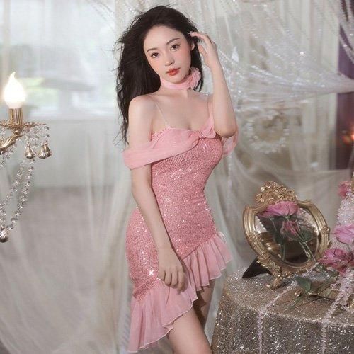 スパンコールの煌めきがまぶしいミニドレス。