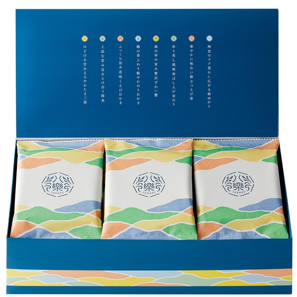 坂角代表商品の「ゆかり」のひとくちサイズのほかにも、海と山の豊かな幸を使用し、素材にこだわったせんべいを1袋で8枚お楽しみいただけます。