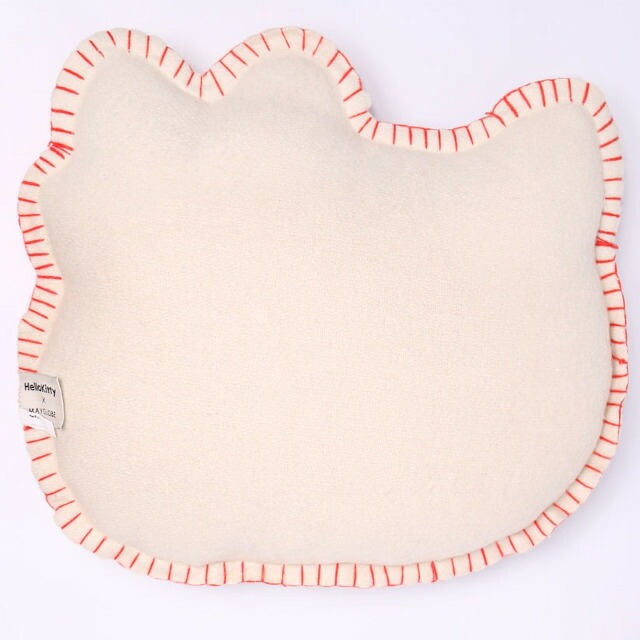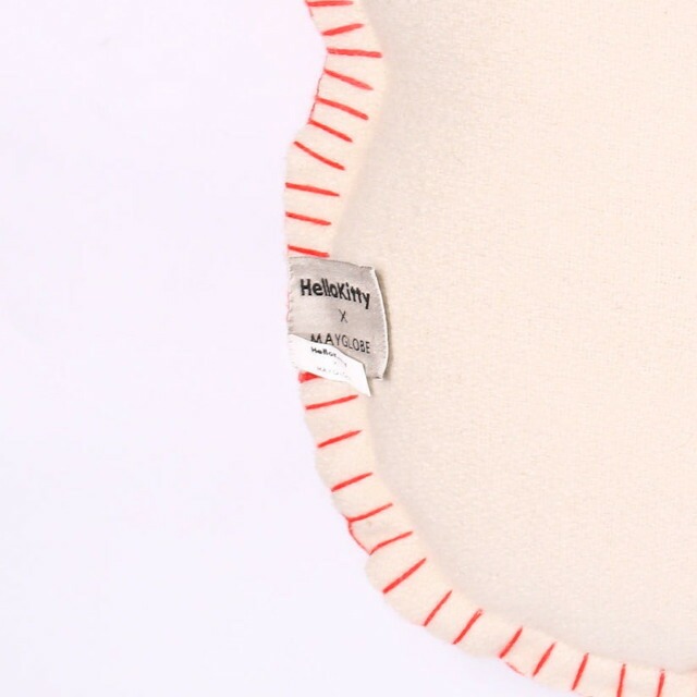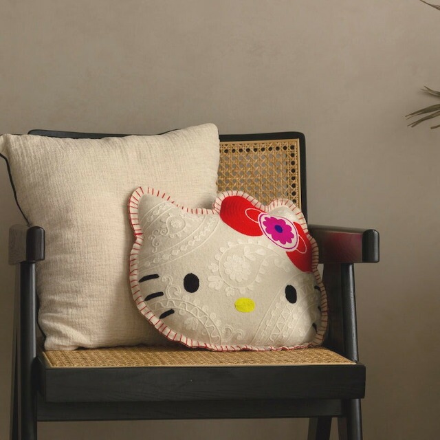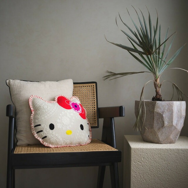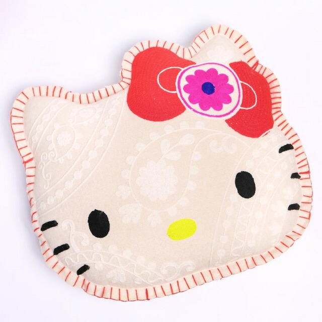 ハローキティの顔型にインドの伝統工芸を使用し立体的かつ表情豊かに刺繍したクッション。
