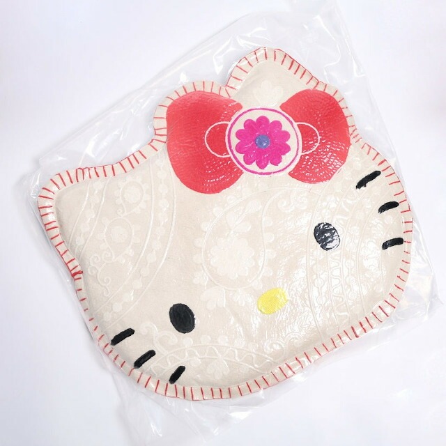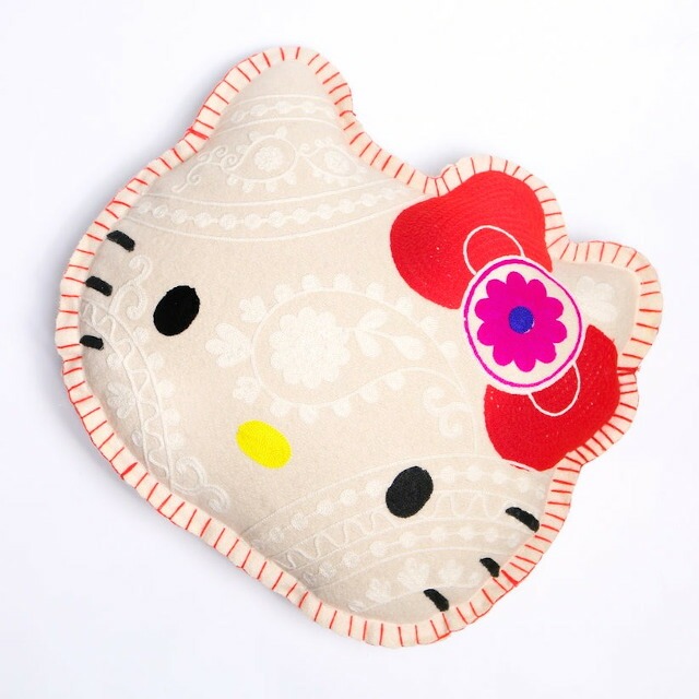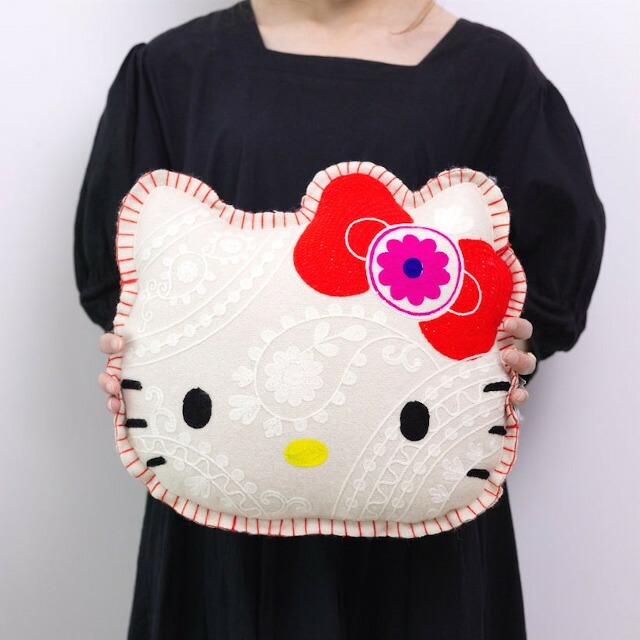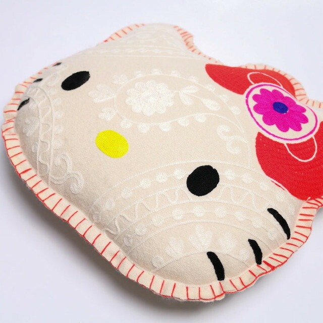 ハローキティの顔型にインドの伝統工芸を使用し立体的かつ表情豊かに刺繍したクッション。 |