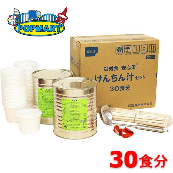 けんちん汁缶詰1号缶(3kg)×2缶、カップ(蓋付)30個、割箸30膳、缶切り1個、おたま1本、取扱説明書