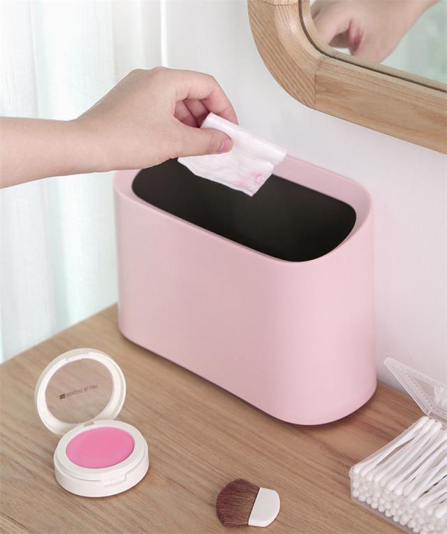 ふたがない卓上ごみ箱。広くになった開口部。綿パッド、ティッシュペーパー、髪の毛、デンタルフロスなど、サイズが小さいゴミは、いつでも片付けられる。