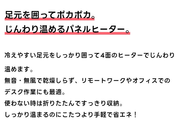 足元を囲ってポカポカ。じんわり温めるパネルヒーター。