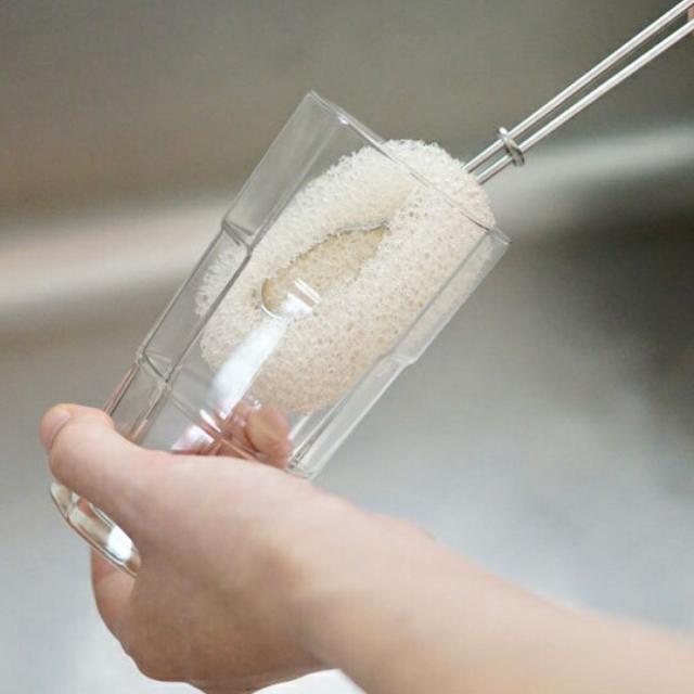 ボトルや冷水筒などの底までしっかり洗えるスティック付きスポンジです。水切れがよく、スポンジが取り外せて衛生的に使えます。