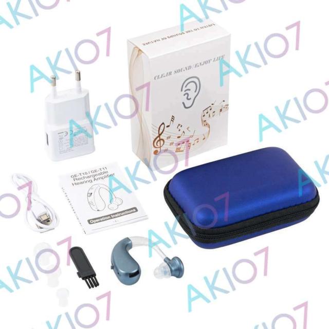 耳にかけるだけのお洒落な高性能集音器。USBに差し込むだけの簡単充電式。電池交換不要で充電後約40時間使用できる。日本専用充電器が付属している。