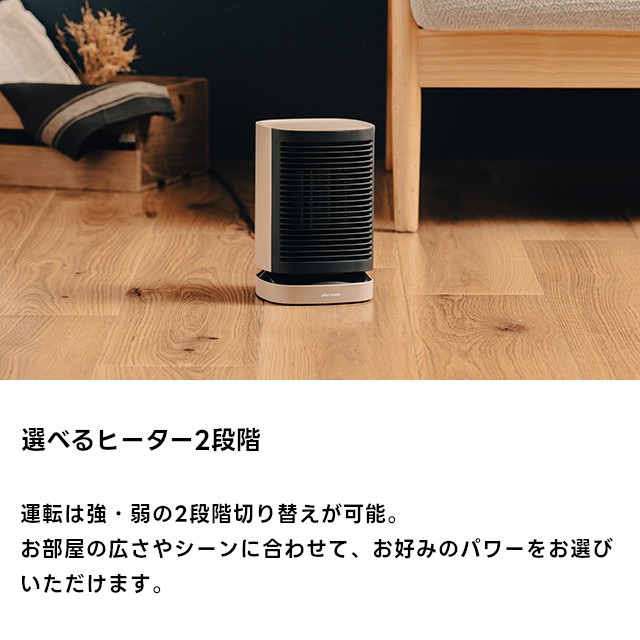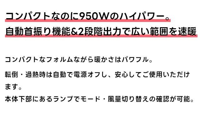 コンパクトなのに950Wのハイパワー。自動首振り機能&2段階出力で広い範囲を速暖! |