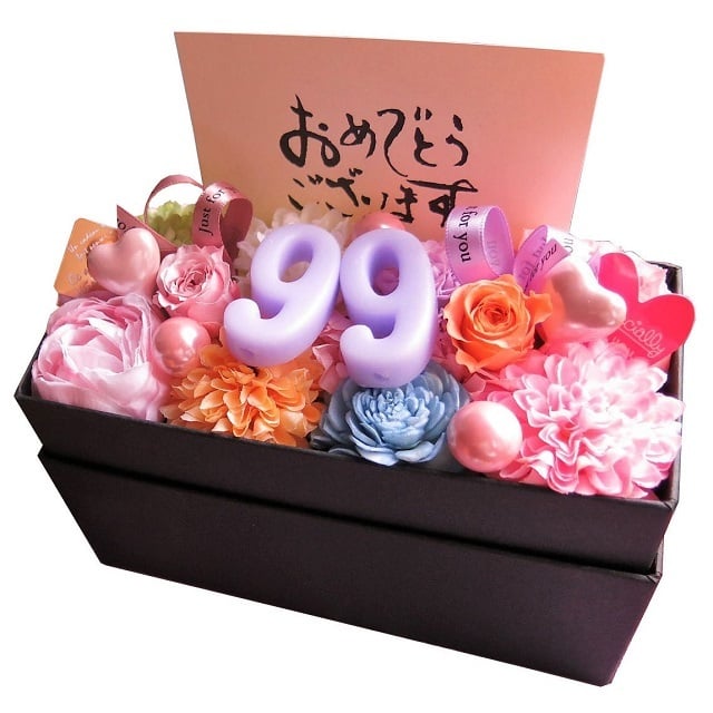 プリザーブドフラワー ギフト 白寿お祝い 99歳 数字99入り 花束風ギフト 箱を開けてサプライズ 横長ボックス ご希望数字でお作り致します