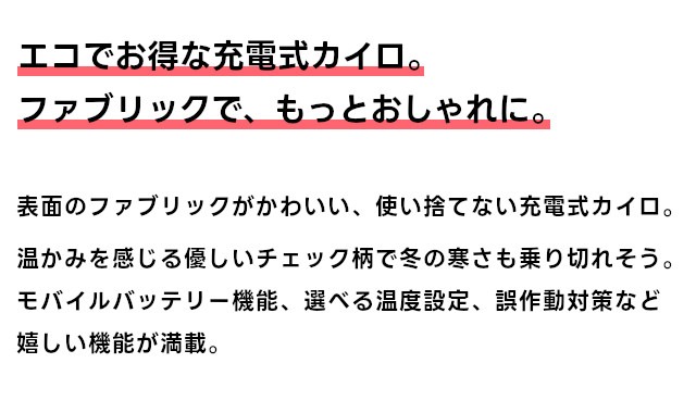 エコでお得な充電式カイロ。ファブリックで、もっとおしゃれに。 |
