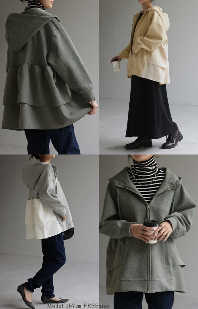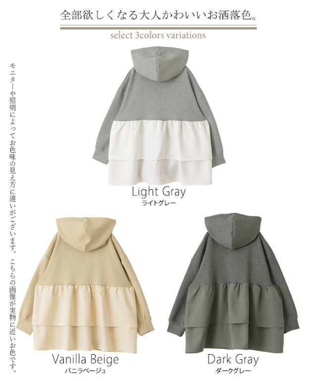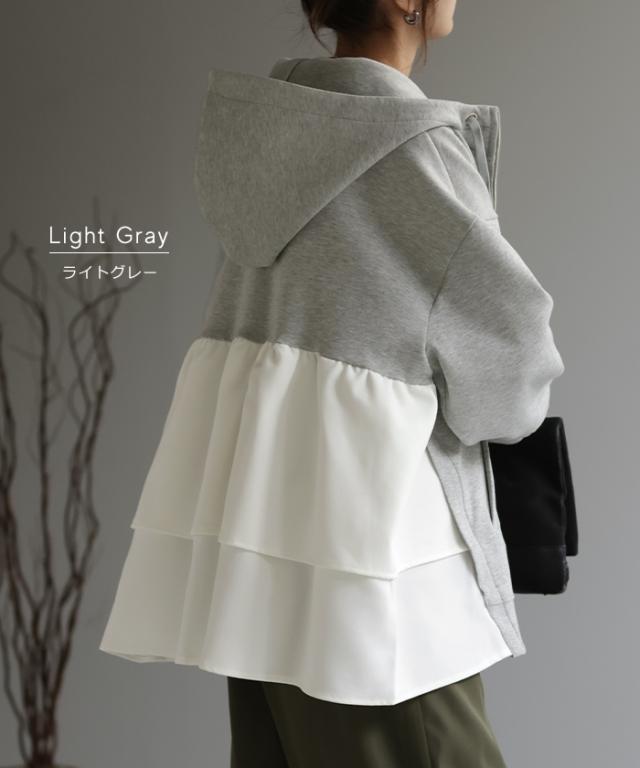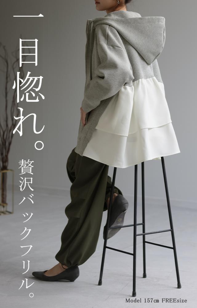 ト・リ・コ 「 大人可愛い。」 バックフリル パーカー アウター レディース ライトアウター ロング トップス トレーナー フーディー 無地 羽織 体型カバー フリル バックプリーツ プリーツ ドルマン ゆったり 変形 大きいサイズ グレー 秋 冬 HUG.U 秋新作