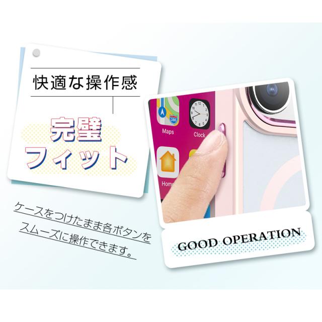 高透過性の高いポリカーボネートと柔軟性に優れたシリコンの2つの素材で落下の衝撃などからiPhoneをしっかり保護します。背面は超クリアであり、iPhone本来の美しさをそのまま表現します。また、操作ボタンとカメラ周りにはアルミ合金素材を使用し、金属のツヤ感で高級感を演出します。