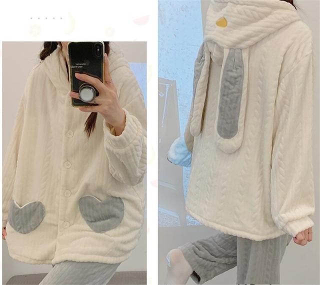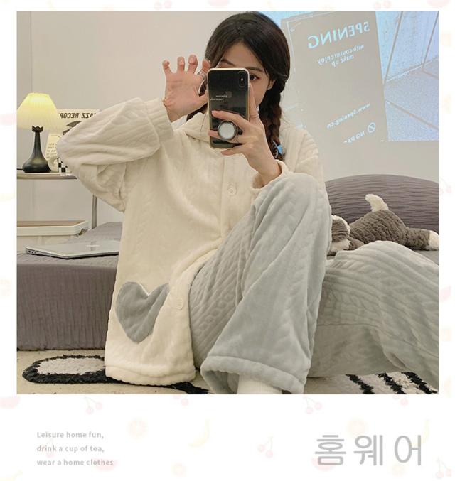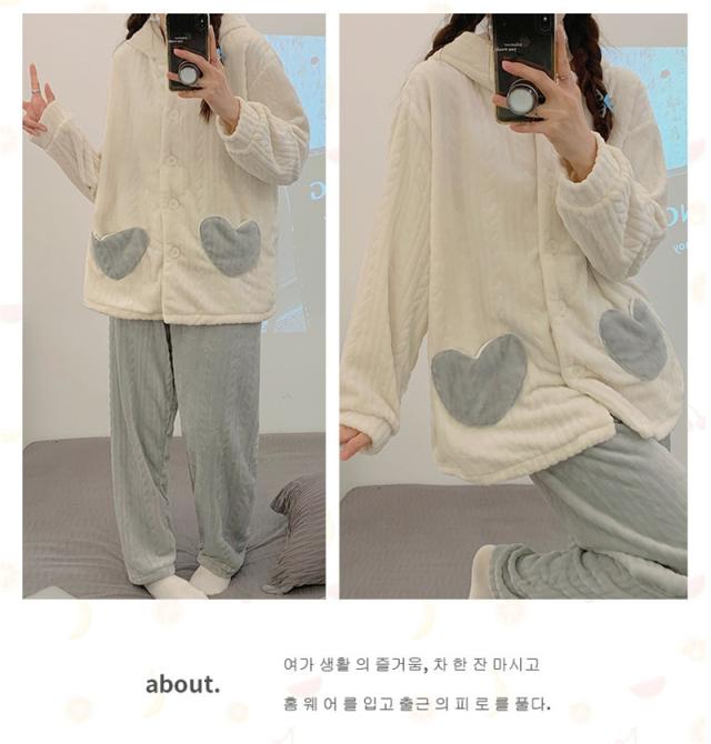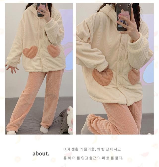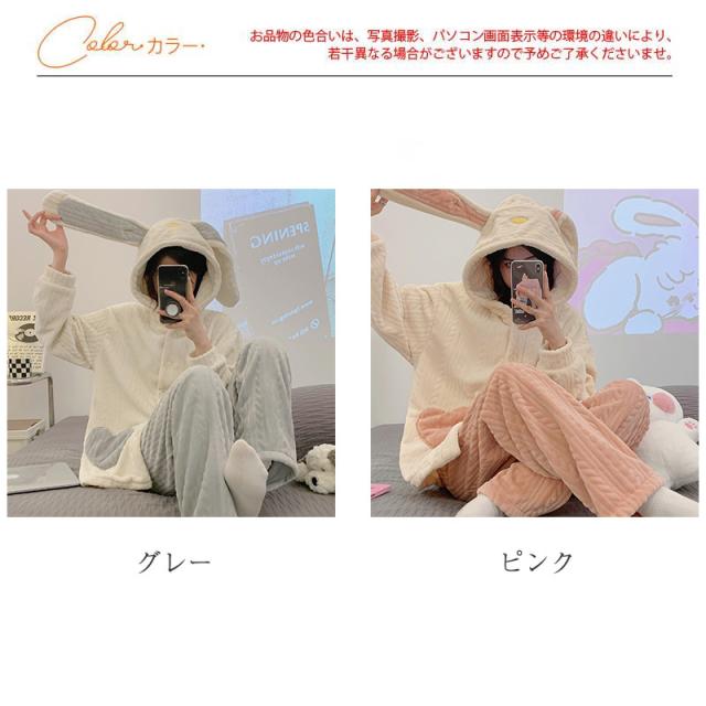 パジャマ レディース ルームウェア 上下セット 厚手 長袖 前開き フード付き もこもこ 長ズボン ナイトウェア 部屋着 暖か 秋