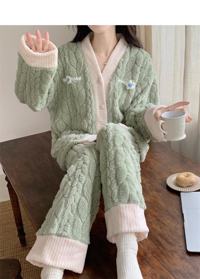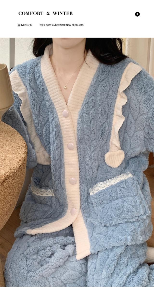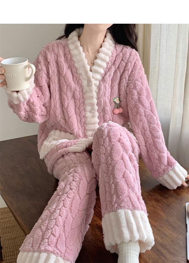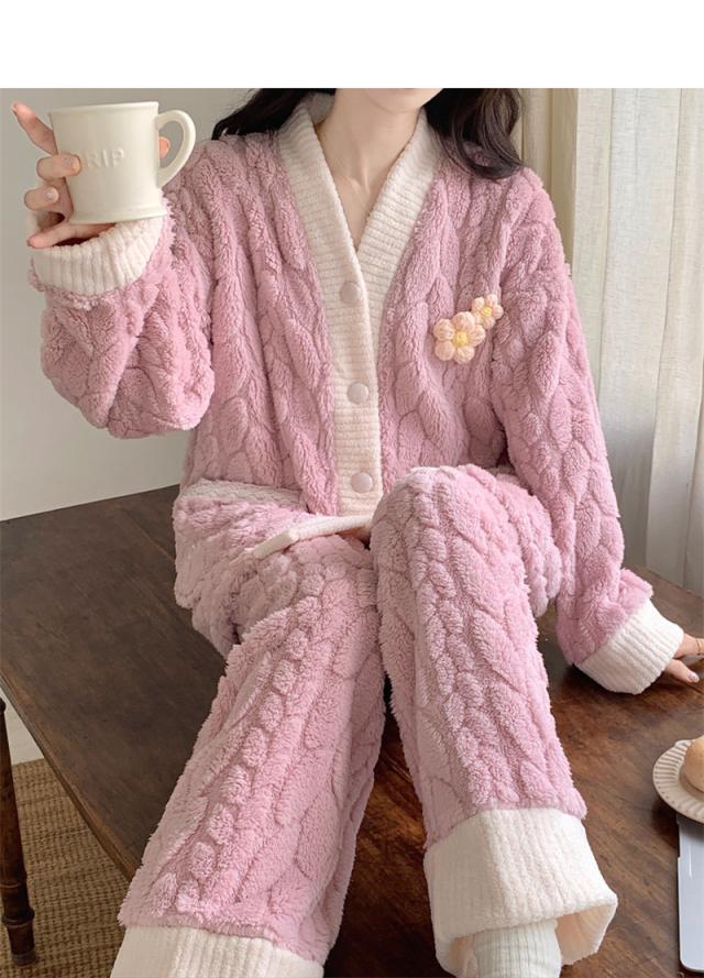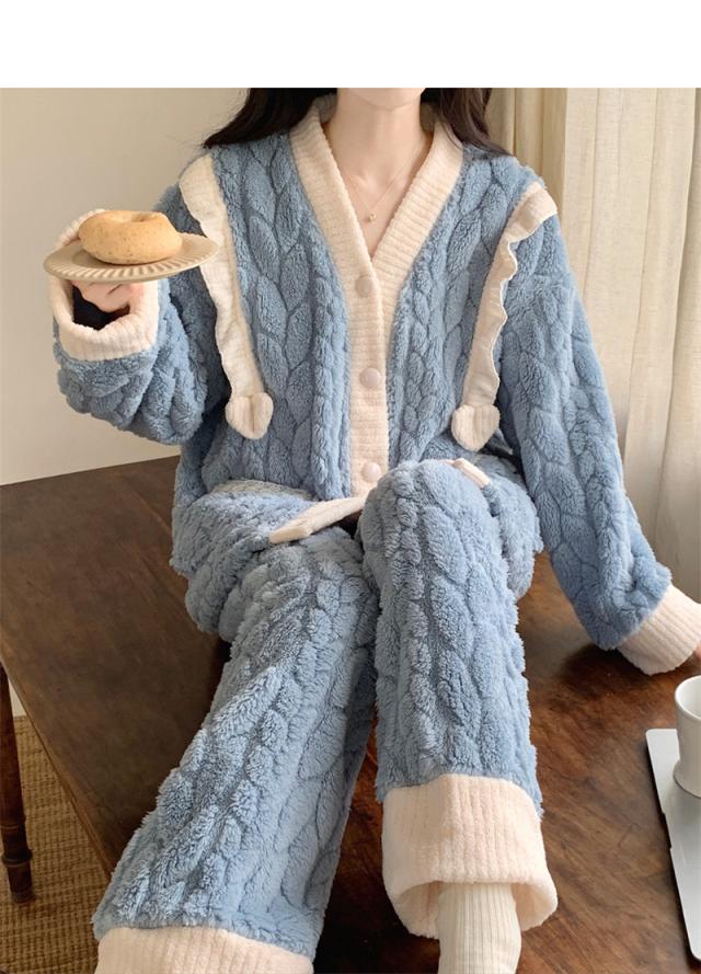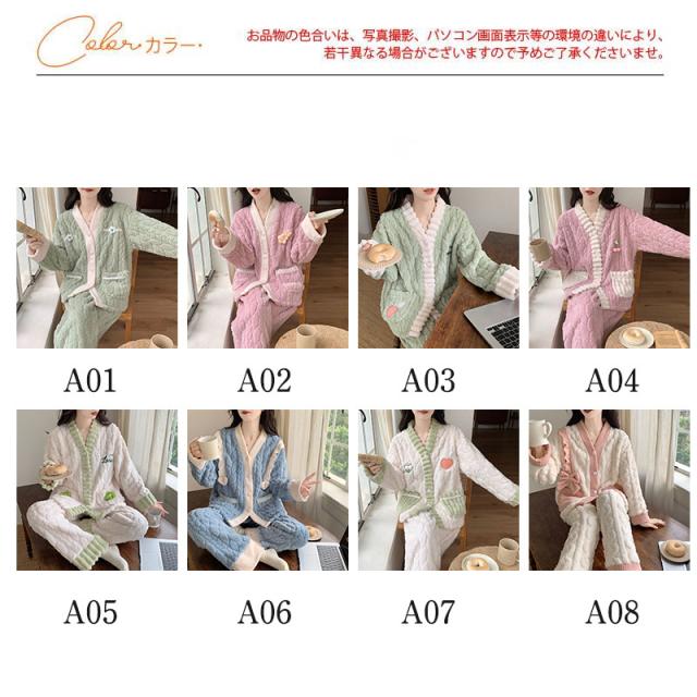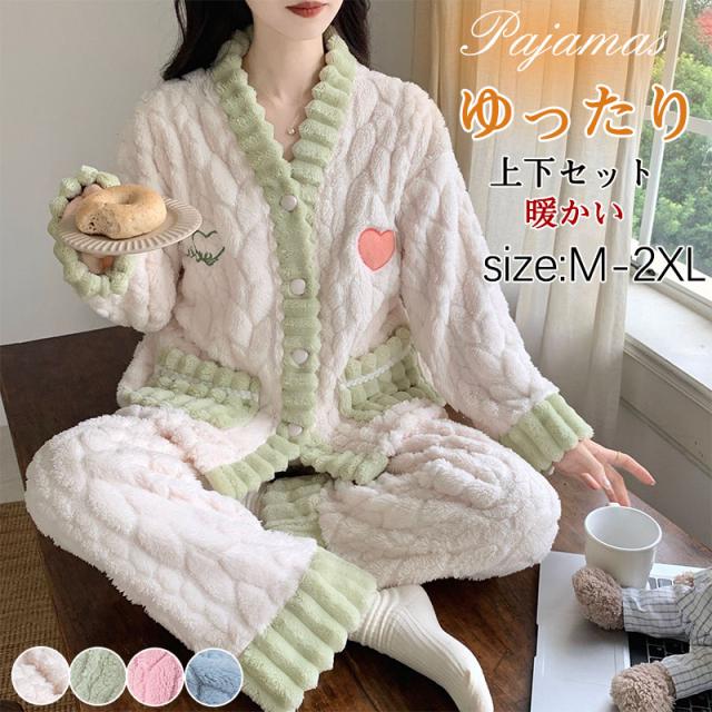 パジャマ レディース ルームウェア 上下セット 厚手 前開き モコモコ Vネック 長袖 長ズボン ナイトウェア フランネル 防寒